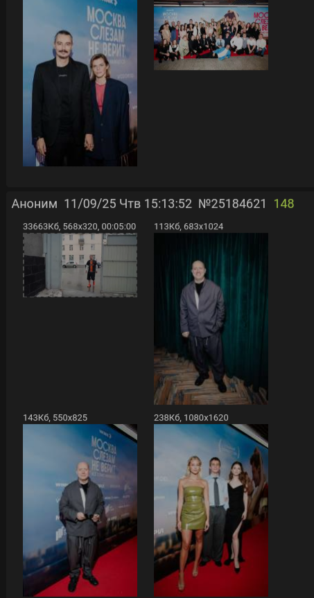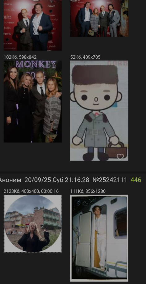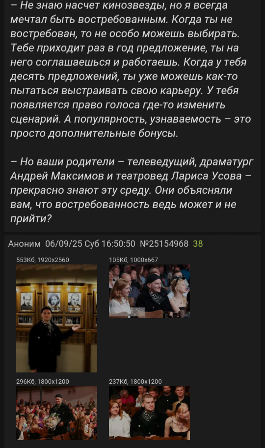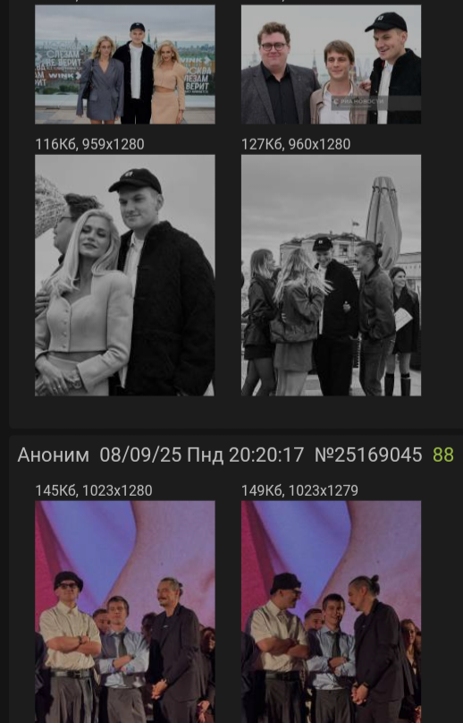 Аноним 27/09/25 Суб 14:36:18 № 25284856 151 >>25283547 Ну тащемта я пишу что думаю, захотел - стихи, захотел - рисунок, зажотел - максимова и пересельдь хуями накрыл. Так-то я после срача с камчаточником тут не очень стал сидеть. >>25290140 Аноним 27/09/25 Суб 14:37:10 № 25284859 152 >>25284042 Кстати прям щас терминатор 2 смотрю! Аноним 27/09/25 Суб 15:25:12 № 25285182 153 >>25277875 >>25275853 Да это скорее всего театр перед Мизулиной которая тоже была на премьере этого фильма,про еблю с водителем Мишей уже месяц назад вбрасывали и все только поржали с этого.