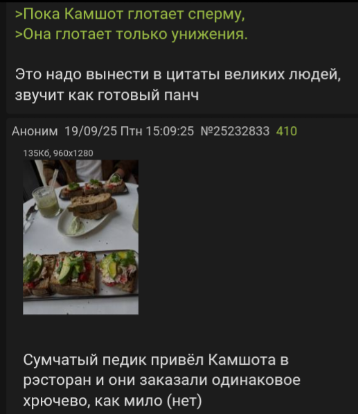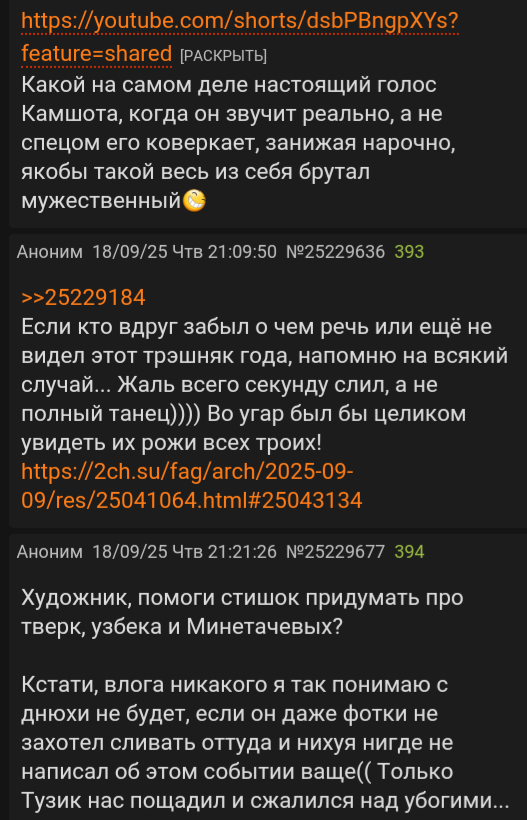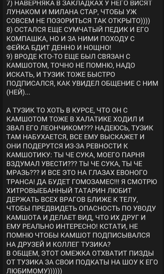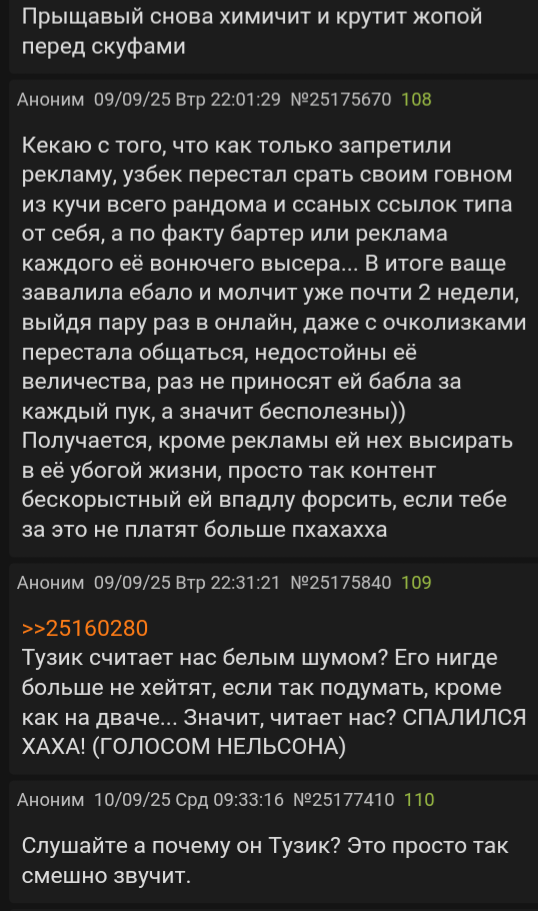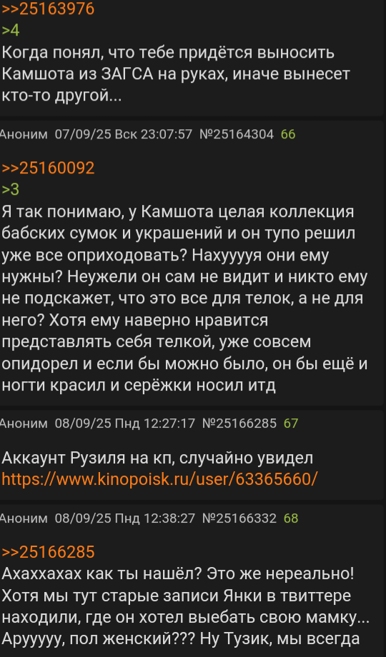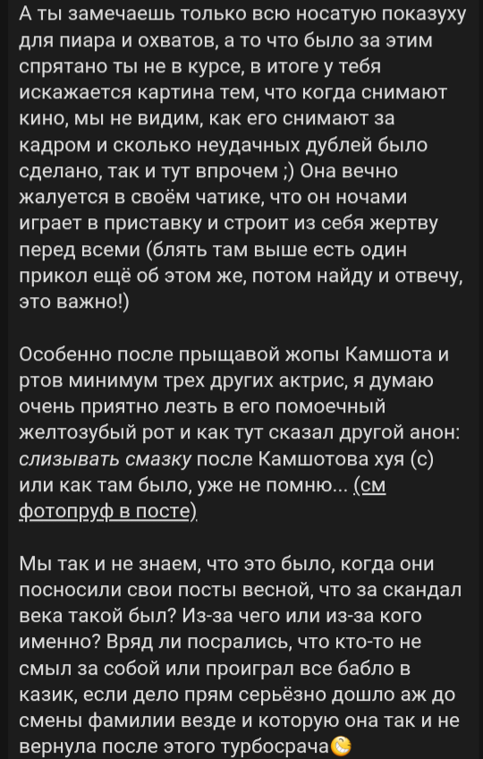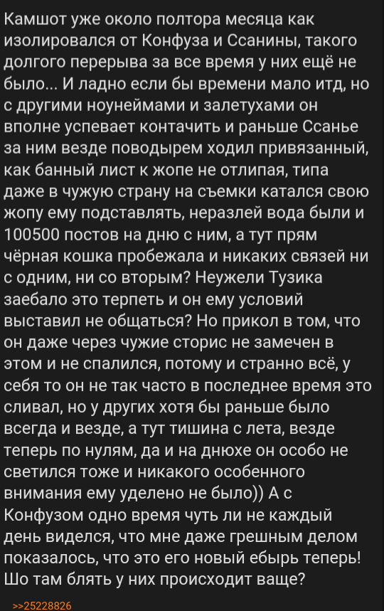 Аноним 29/09/25 Пнд 00:17:13 № 25297060 225 >>25296902 Я думаю, Утюг целка, сорян и не летает в Дубаи и если даже и нет, то скорее не из тех, кто станет рисковать и ебстись с незнакомыми, в отличие от безбашенного Камшота, который вечно хуйню вытворяет и всякие необдуманные поступки на эмоциях, типа шарится ночью в лесу и на болоте с ноунеймами... По датам там могли и консервы быть хз, он же путал следы, когда они были с Тузиком вместе, а он сначала ваще про Турцию пиздел всем, хотя был в Африке, а потом уже признался, но точные даты не уточнил и про Дубай ваще молчал, ибо он потом сразу после этого затишья резко в Москве появился, я даже думаю, что они могли прям вместе с Тузиком на одном рейсе прилететь, ибо там разницы почти не было, он на день позже Тузика вышел в эфир, а смысл ему ждать было столько времени хз чего и и пилить рекламу с консервами? Но там его любимчик Чехов нечайно слил, когда они снимали финал и это было прям аккурат перед приездом Камшота в Дубай, не помню то ли 20, то ли 21, ну короче за день до их встречи))) Так что по датам он иногда нарочно пиздеть может и все, что он сам говорит, а не другие люди, не стоит верить, нужно делить на 16! Он даже когда там был в Италии, спецом скрыл точные даты приезда, когда понял, что сам запутался в датах и лучше молчать, так что мог и позже скинуть, вон Тузик же кидал его кружок от имени своего канала и спустя время, там же даты не написаны, он же дб когда-то там поступать в Дубай и доки подавать, а значит он туда точно ездил, а мы с июня такого не видели, то есть он ездил скрытно, возможно прикрываясь другой поездкой или долгим молчанием как всегда, даты в кружках не указаны, так что это не гарантия! Да он в любом случае бесконечно занимается этим пиаром, даже без дат, недавно только Милану Стар зашкварил в своей помойке, все отрицая и любые отношения и что все равно его сердце свободно, а жопа занята Тузиком🤭🤫 Насчёт Турбо ваще бред, че бы его имя не назвать, как у всех? Он че особенный? Ему бы проще было это совсем не постить, как с Тузиком, чем скрывать имя?