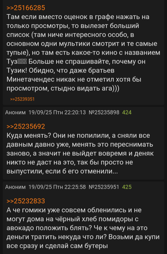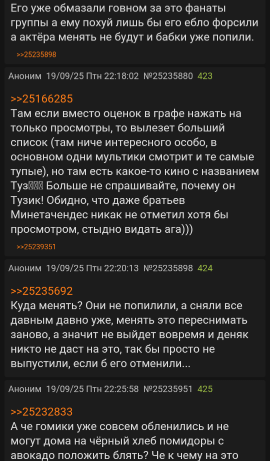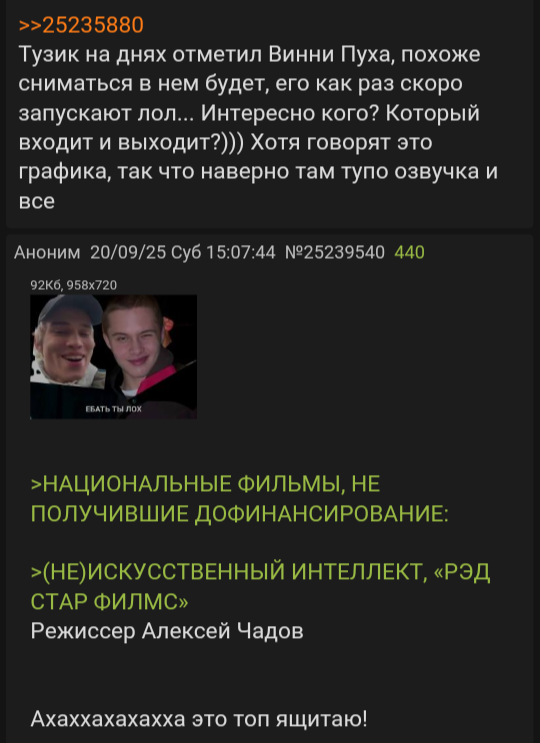 Аноним 27/09/25 Суб 00:54:38 № 25282673 136 С ума ебануца... Оказывается, у СП было 2 варианта: с матом и без! Почему не показали эту версию? Они это типа одновременно снимали по 2 дубля сразу и в дубли с матом актеры больше вкладывались (мой шок теперь в шоке)