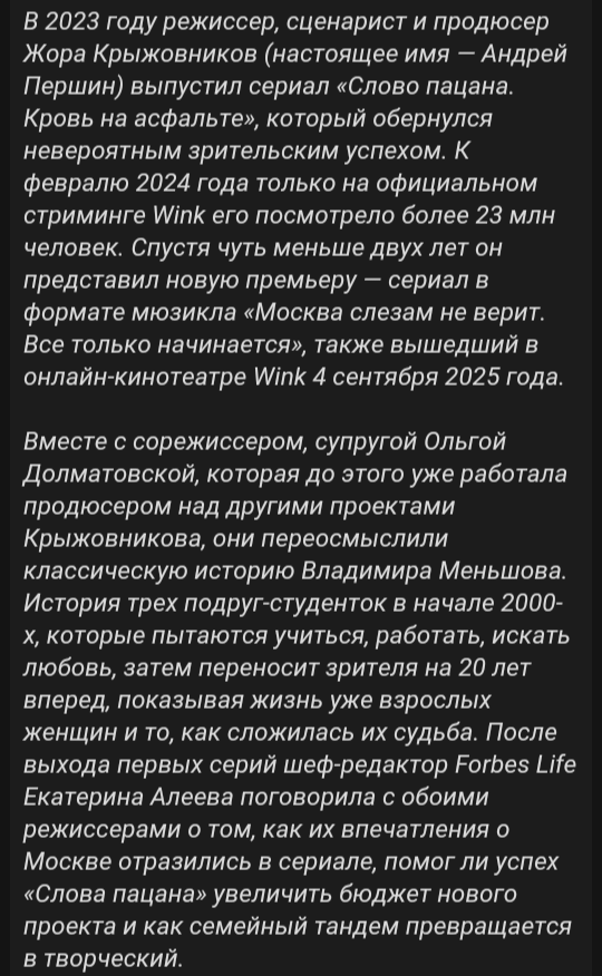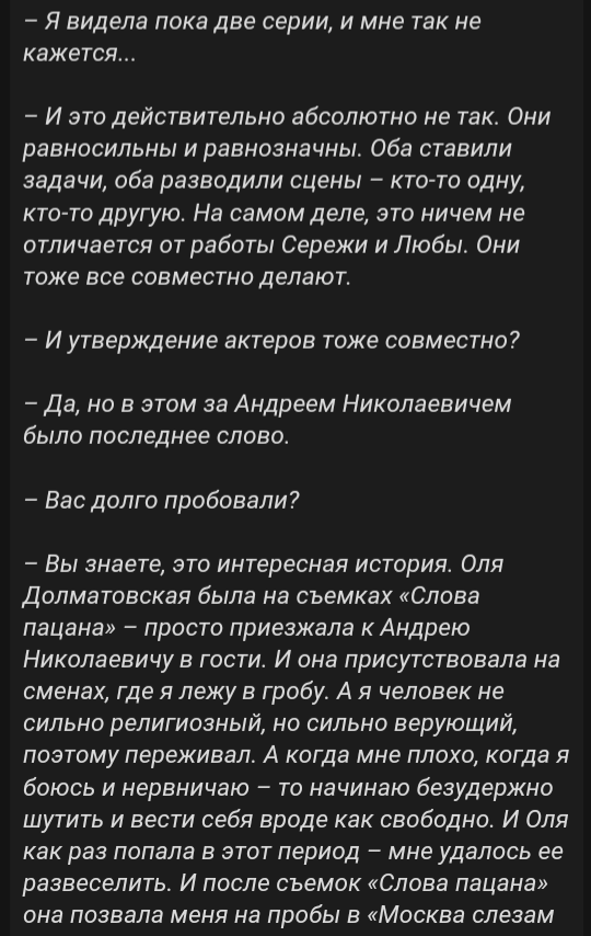 За его спиной — «Текст», «Дама Пик», «Аутсорс», «Слово пацана», «Чемпион мира», «Фишер» — проекты, в которых он неизменно ищет не форму, а подлинный смысл, не эффект, а человеческое присутствие.
