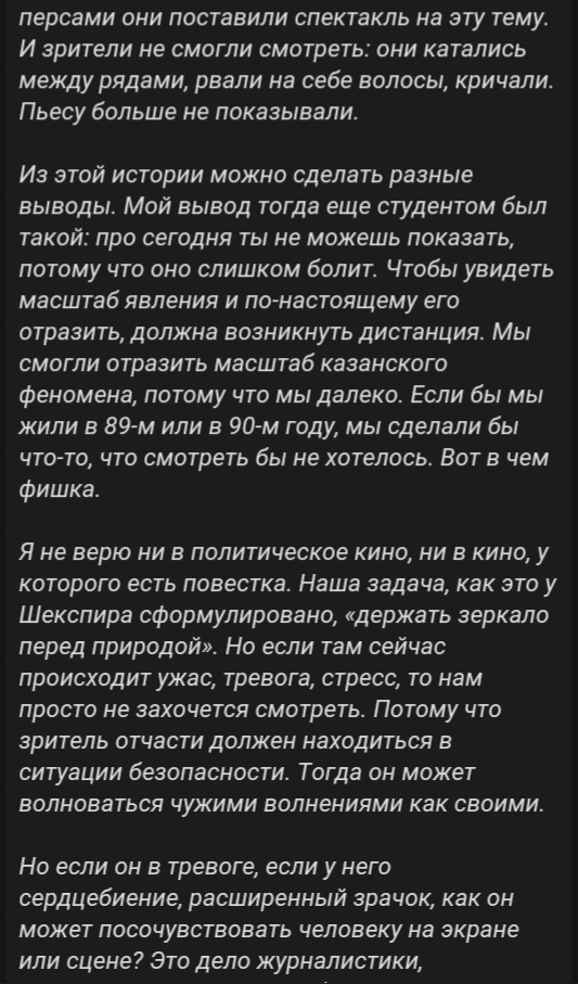 А в какой момент соцсети, из площадок, призванных объединять этот самый социум, превратились в плацдарм для ненависти, невежества, жестокости, соревнования и вечной эмоциональной и моральной пытки? В последнее время я всё чаще ловлю себя на мысли, что мне больно, что хочется плакать, и чем больше я сижу в соцсетях, тем тяжелее. (Пример) Что за тренд на ненависть полов друг к другу? Много сложных, неоднозначных вопросов в этом споре? Да, но на то мы и люди, чтобы за счёт разума тянуться к добродетели и решать эти вопросы. Может, не сразу, не без боли и ошибок, но решать и идти дальше, рука об руку. Блядский «успешный успех» в нас развивает тревогу, чувство вины, страх, зависть. Слишком много контента - и всё меньше в нём сути. Мы повторяем друг друга, следуем за трендами, количеством просмотров, выгодой. И это всё можно понять, но нужно помнить, что мы несём ответственность за то, что делаем. Мы всё меньше говорим о вещах по-настоящему важных - таких как любовь, доброта, сопричастность, ответственность, о том, что у нас взаправду болит. Мы всё больше пускаем пыль в глаза и врём сами себе, что нам всё нравится. Я не хочу ныть, я не проводник истины, но я чувствую необходимость делиться этими чувствами, потому что уверен, что не мне одному больно от этого. Я не эксперт и уж точно не истина в последней инстанции, я могу быть неправ, но я так это почувствовал. И что это - обострённая эмпатия или подкрадывается старость?
