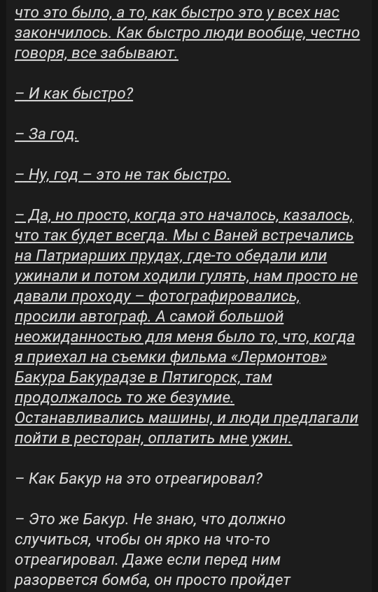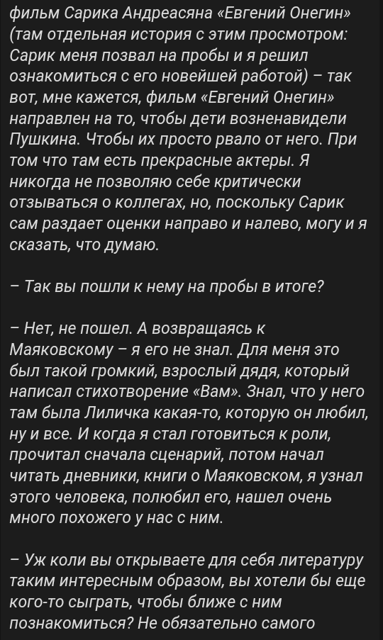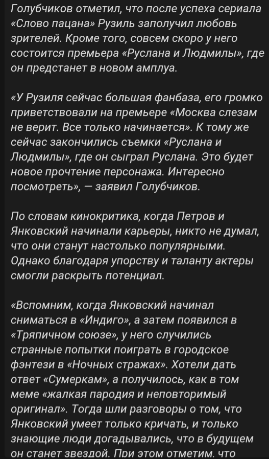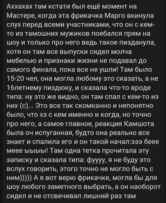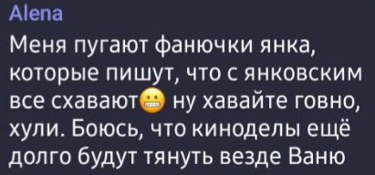 >>25465460 Нет никакой великой любви между Янкой и Максимовым,максимум Янык его пехнул а тот может забыть не может хотя тот и за Верником похоже бегал.У Яныка там то Тихон,то Евдокимов,баба из Москва слезам не верит, Кристина Анус и ещё кто-то и если бы Дианка не залетела то он бы и её нахуй послал."Ой вот там Янка отшил Кала и Кал хотел слить про великую любовь с Максимовым но Филя Янковский сказал что уничтожит его за это и после этого Кала посадили на таблетки" блэт как они вообще себе представляют чтобы он слил подобную информацию и его бы не засмеяли и не подали в суд за клевету?