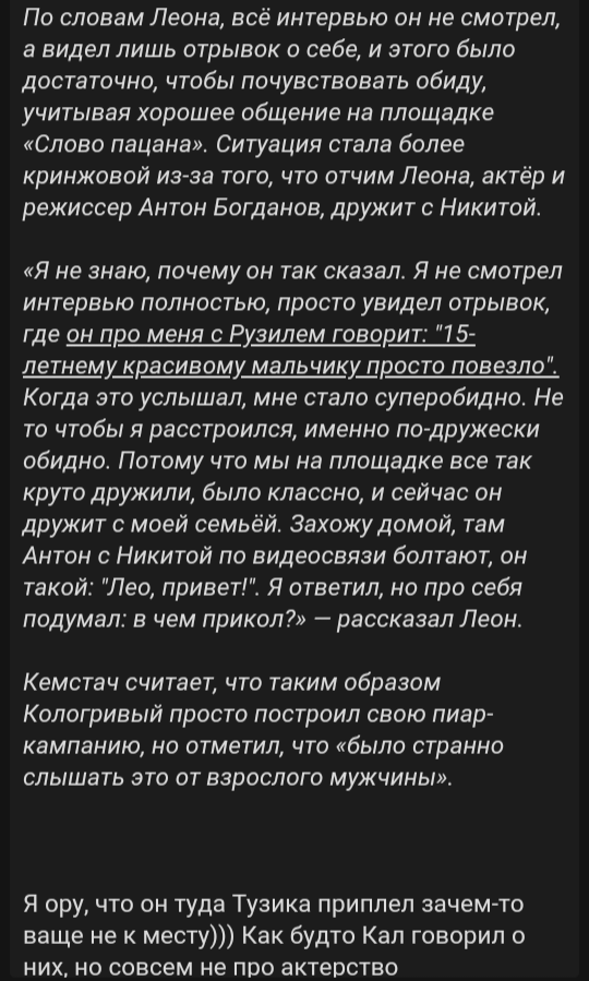 Смотрю вписку)) Зуля делал порношаржи на училок... Кто-то ещё сомневается, что он и есть иуда??? Там его в комментах все хвалят, пропуская мимо ушей все его зашквары, типа какой неебаца начитанный после Макана, как сложно удивить глубинариев простым умением пиздеть, там еще эта история про друга, с которым он поступал и друг куколд его простил! А у Славы на полочке фотки с Леоном стоят, пиздецнах ваще без палева😳