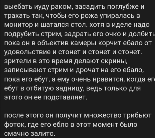 Такое чувство, что эту дичь иуда сливает, чтобы посмотреть на их реакцию... Блять, а что если очевидно, то это сразу не правда что ли??? ЗАЕБИСЬ логика! Типа он поэтому не может поверить в это, что слишком понятно? ААААААА как же сука бесит!!! Что за тупость нах??? Человеку 50 лет, он дважды два элементарно сложить не может и сопоставить по пруфам! Как же у меня горит с жтой непрошибаемости и слепоты или нарочного перевирания фактов и подмены понятий! Зла не хватает сукааа🤬🤢🤮 Как же активно работают его говноагентши конченые, чтоб им гореть в аду, старые носатые лесбухи!