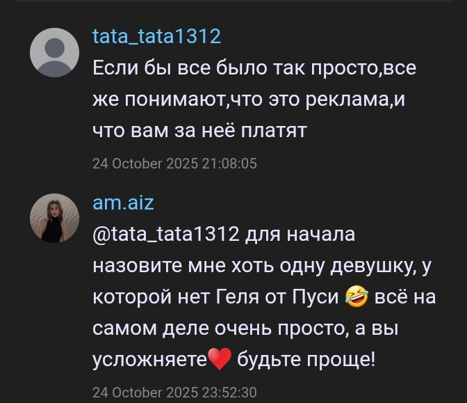 Кто-то должен был это сделать))) Аноним 29/09/25 Пнд 08:05:57 № 25298512 Наконец-то им стали норм комменты писать😁 И кстати Тузик таки поставил лайк любимому на коммент и спецом позже всех, чтоб никто на этом сильно не заострял внимание и не заметили типа, когда уже большинство увидели фотку и забыли про неё лол