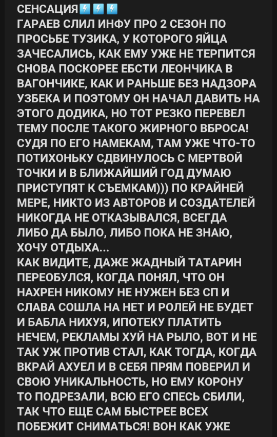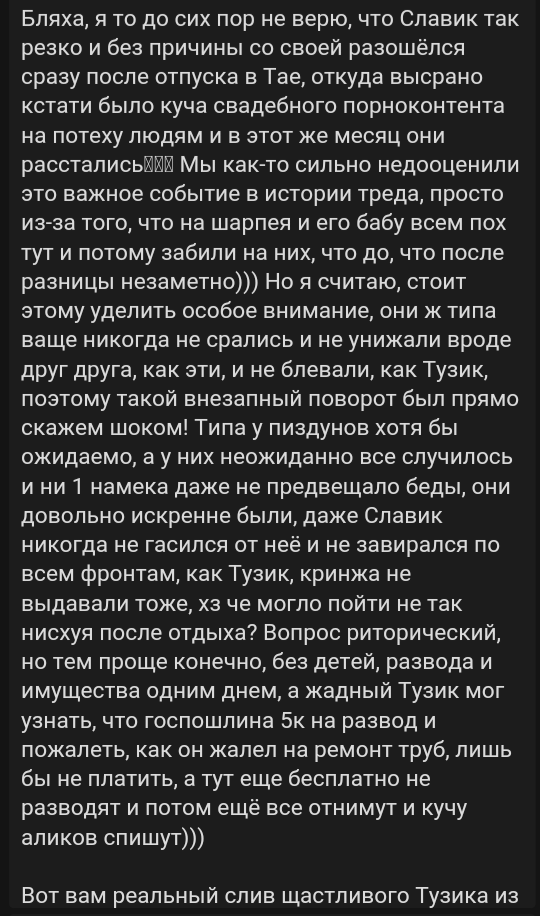 Бляяяяя, как перестать орать? А вдруг это Турбо был? Там в посте прямо есть пасхалка насчет СЛАВНОГО... Ну не такое уж и частое слово, чтоб его туда вклинить не к месту? Оррр, так получается Славик разошёлся со своей, чтоб эскортников ебсти, а не под скуфов ложиться, как мы сначала подумали, когда осознал себя и устал строить примерного мальчика🤭