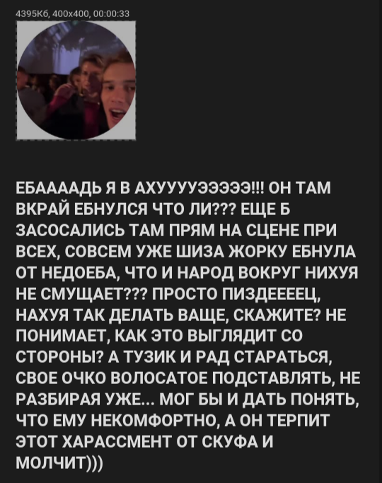 >>25461223 Короче пошла ебанина для прикрытия Жопы Тузика,про Кала и Янку звучит как полная ебанина потому что Янка тогда с Тихоном куда более жирные вещи делал чего стоит то видео из вагончика и все это было на поверхности и нахуя там Калу что то сливать про Максимова и кто бы ему поверил опять блядь про таблетки какие-то как у иуды где он также якобы ебался с женой под таблетками.