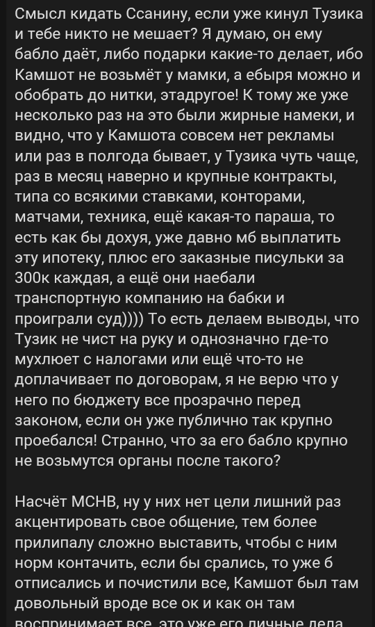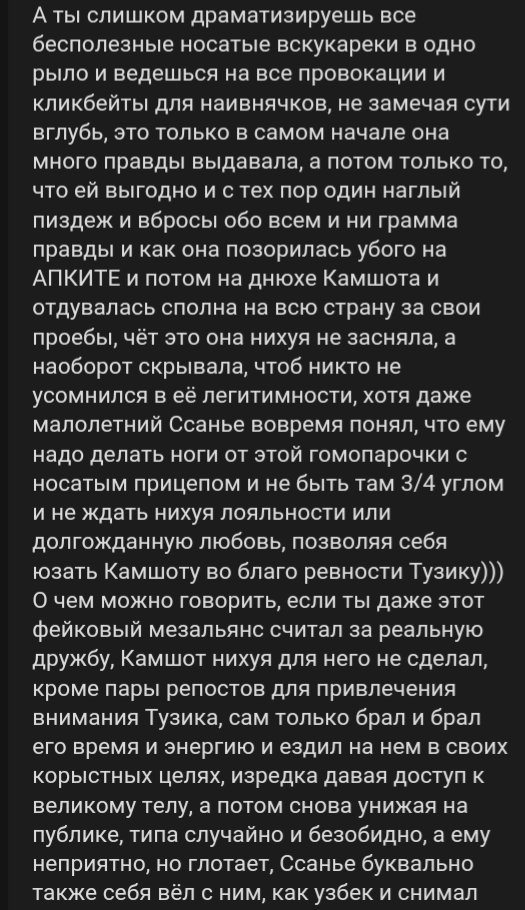 В палате этого Антона Асс была инфа что он за бабки блокает негатив и закрывает темы,по этому замяли тему с беременной любовницей Борисова и т.д. Мамка Камшота просил могла бабки ему занести и он бы эту тему замял (Да он и не начинал толком но уже в 2-х видео вопит что это не правда) но вместо этого начинается какая то ебанина про Фишера и Янку (Которая согласно той же багине возможно спизжена с какого ТГ) и откровенный бред про Янку и Кала.