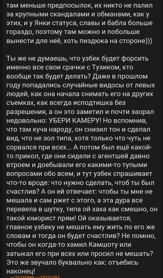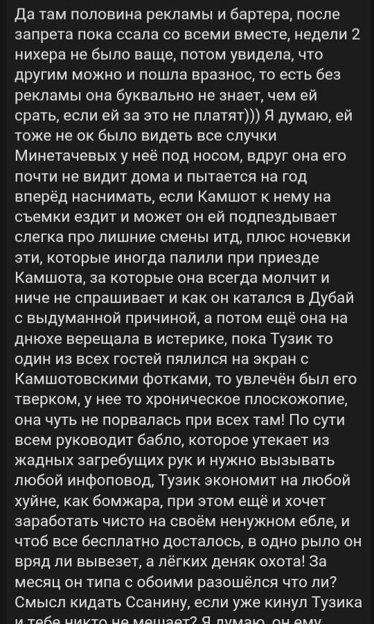 Бля агентши не боятся что кто-то их спалит что они все это вываливают в инет? Ладно там мы тут обычные люди а эти не боятся? Хотя вообще тема странная что после того как слили про гандоны и эскортника в Дубаях то через некоторое время полилась эта тема про якобы Янку и Максимова, какая то бредятина про Янку и Кала и Антон Асс орет что Минетачевых это все бред.