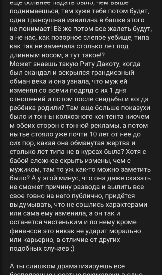 >>25465002 Была б она еще хоть немного вменяемой и адекватной, типа Сливкиной, которая все приняла и поняла и не стала кго насиловать и удерживать и теперь с ним спокойно общаются везде как друзья и даже ездят вместе и сразу понятно, что она знает реальную причину их развода))) То еще мб узбекв даже жалко было бы в этой ситуации и мы бы сочувствовали здесь всем тредиком и лучи поддержки посылали, как же так сложилось, какая она несчастная, не заслужила такого и блаблабла... Но поехавшая терпила и бучиха ебу дала от чсв и звезданутости и похлеще кала, ибо он уже давно никак не хайпит, а шмаровозка поганая вечно какие-то дешевые вбросы выдает, чтобы реанимировать медийку и провоцирует аудиторию на всякую несносную парашу, чтобы ей подлизали или еще что триггерное, заваливая всех своими наитупейшими блять вопросами, поэтому все заслуживает, что получила от Тузика и как жестоко он над ней поглумился, почти не задумываясь не просто выебав Камшота в вагончике, когда сыну было всего 4 месяца и у нее там другие проблемы были без сна и отдыха, а ещё и продолжив нахуй крутить роман с ним больше двух лет, что даже не скинуть на то что он ебырь олнодневка по случайности и от скуки, а у него прям реально вторая жизнь/вторая семья/двойная жизнь за спиной и в изменах всегда важнее не ебля по пьяни с кем попало, а эмоциональная привязанность и любое вкладывание в любовников, как финансовое, так и моральное, что у них в обоих случаях безусловно есть и если он это не может прекратить, то явно побольше, чем с узбеком, ведь мог бы спать хоть с кем, а не только с одним, а это уже не просто перепих, а целые поездки к друг другу в Казань/Дубай итд, то есть сам Тузик ее опустил ниже плинтуса первый, а не мы, поэтому так и надо этой беспринципной мразоте с родней из убийц, тьфунах! >>25450110 >>25450155