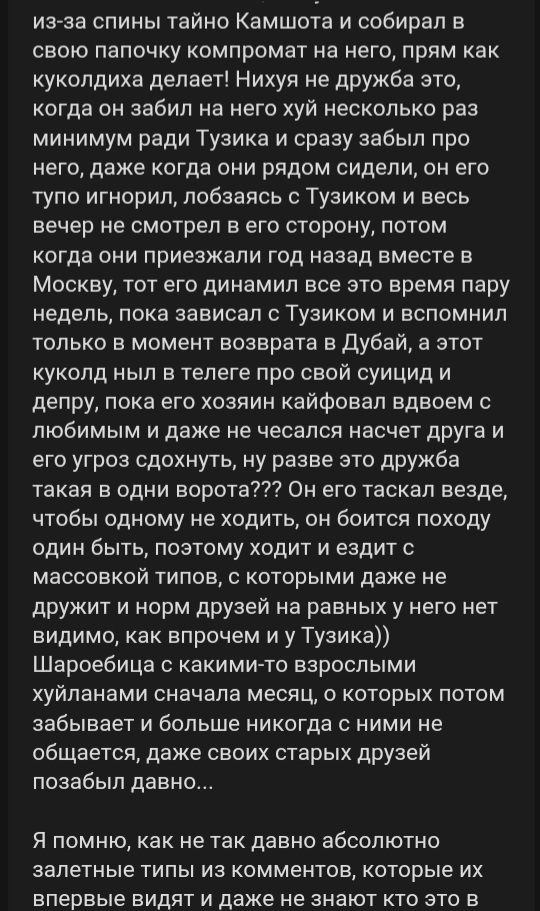 АНОШ, ВСЕМ АБСОЛЮТНО ПОХУЙ НА КАМШОТА, ТЫ ЖИВЁШЬ В СВОЕМ МИРЕ, ГДЕ КОМУ-ТО НЕ ПОХУЙ НА КАМШОТА, НО НИКТО НЕ СНЯЛ ВПОЛНЕ ОТКРЫТЫЕ ПОХОЖДЕНИЯ МИНЕТАЧЕВЫХ ПО ДУБАЮ И ОН САМ УВЕРЕН В ЭТОМ, ЧТО ОН В БЕЗОПАСНОСТИ, ПОЭТОМУ ЗОВЕТ ПИАРЩИКОВ НА ПОМОЩЬ В ТАКИХ СЛУЧАЯХ, ВЕДЬ ОН ЗНАЕТ, ЧТО НИКТО НЕ ЗАСНИМЕТ И ОН ЗРЯ ЖОПУ РВАТЬ БУДЕТ С ПОДСТАВНОЙ КОНТРАКТНИЦЕЙ И ПОЭТОМУ МОЖЕТ С ТУЗИКОМ СВОБОДНО ГУЛЯТЬ ПОЧТИ ВЕЗДЕ, И КАК ИХ ДАЖЕ В МАЕ 24ГО, КАК ОН СКРЫТНО ПРИЕХАЛ И ОНИ КУДА-ТО ХОДИЛИ, НО ТАК И НЕ СЛИЛИ ЭТОГО И НИКТО ДРУГОЙ КОНЕЧНО ЖЕ НЕ СЛИЛ ТОЖЕ! Ну ладно допустим в этом году до них дела не было, но в марте 24го они же были на пике и их тоже никто не снял, как они с Камшотом в кафе сидели после ночевки хз где вдвоем, что аж пришлось снимать самим, бедолагам и удалять потом🤭