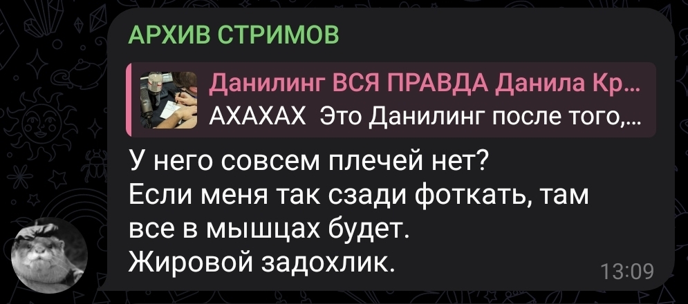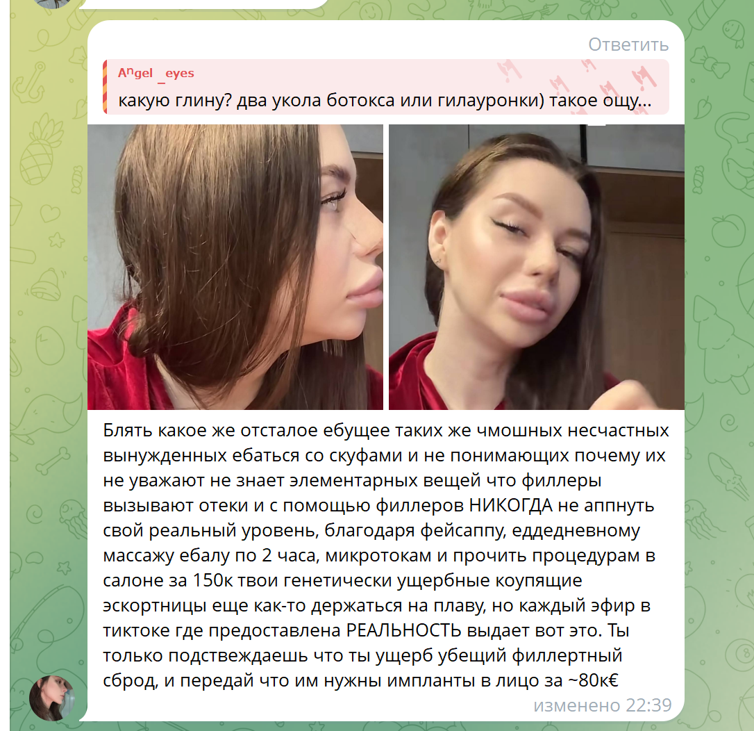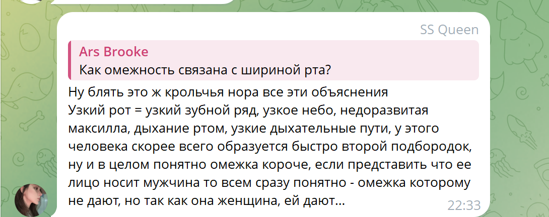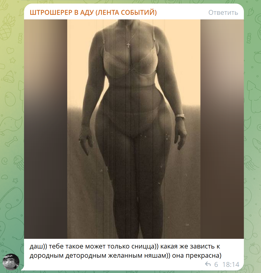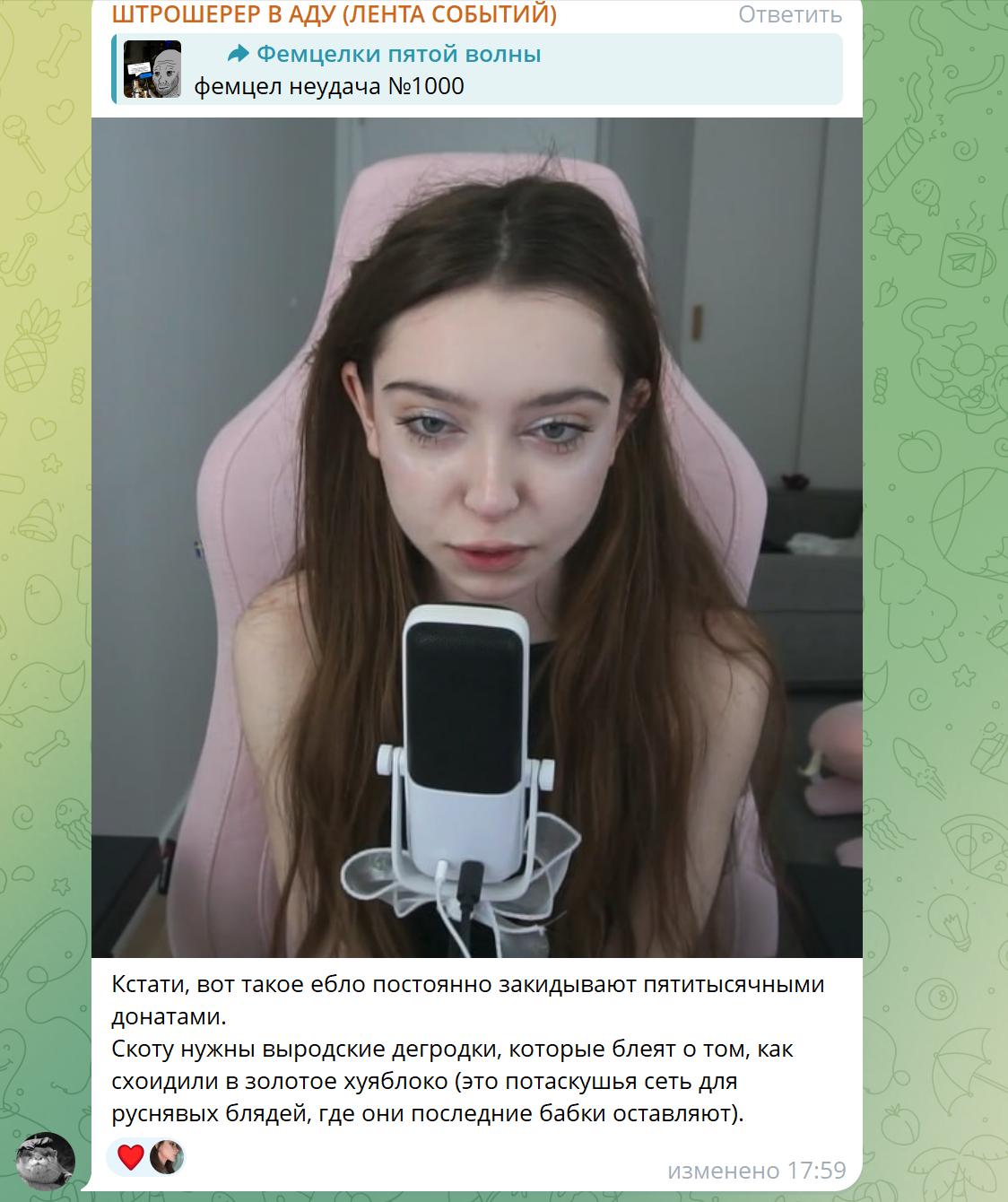 Как то всё опять про подбородки, про инцелов, плодячку. Я думал даша стала тру бандеровкой, будет продвигать захохляцкую шизу, стримить с всушниками, собирать им на меф. А она за старое. Видимо до последнего хочет усидеть на двух стульях