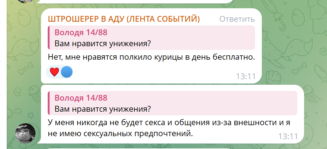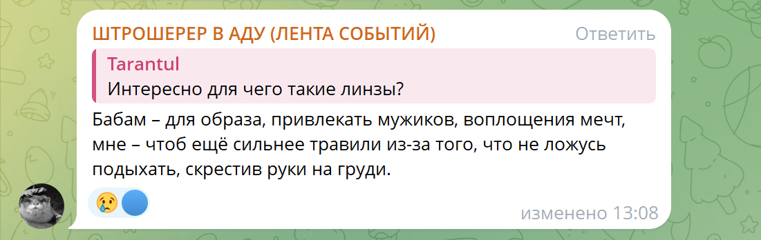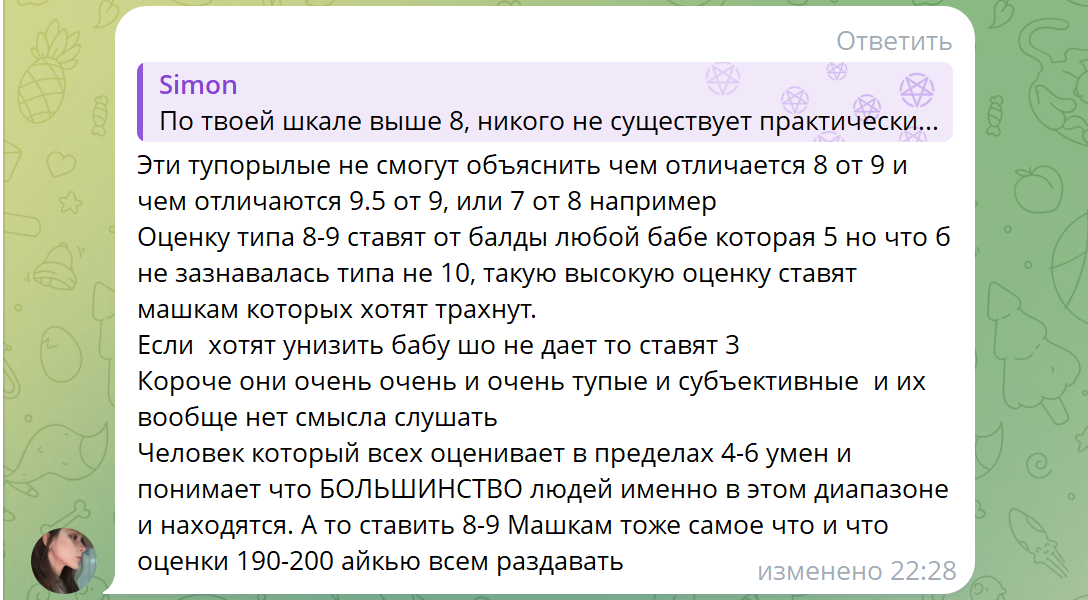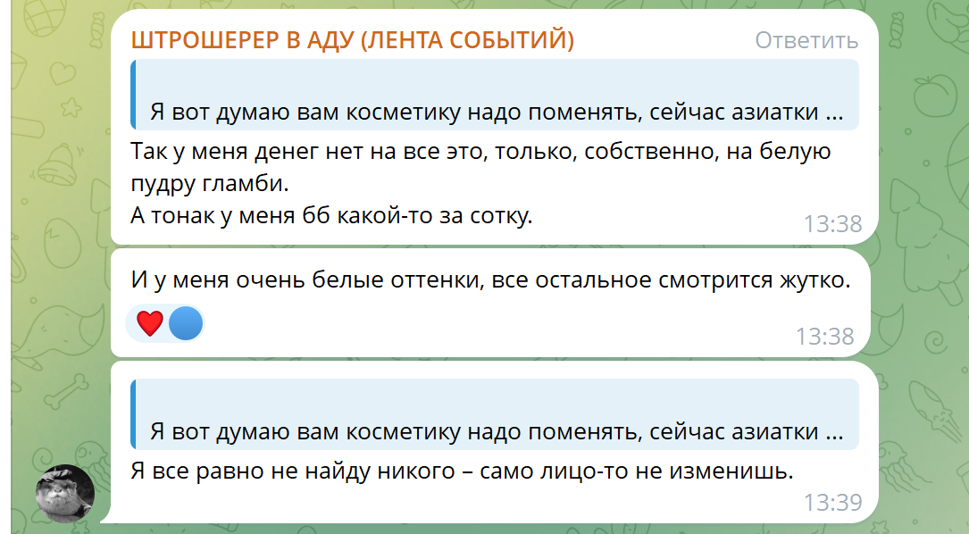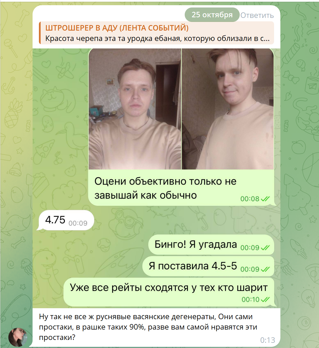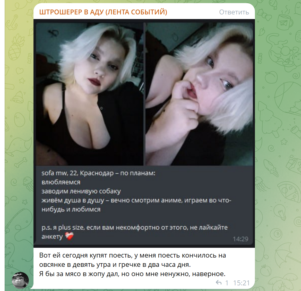 Как то всё опять про подбородки, про инцелов, плодячку. Я думал даша стала тру бандеровкой, будет продвигать захохляцкую шизу, стримить с всушниками, собирать им на меф. А она за старое. Видимо до последнего хочет усидеть на двух стульях