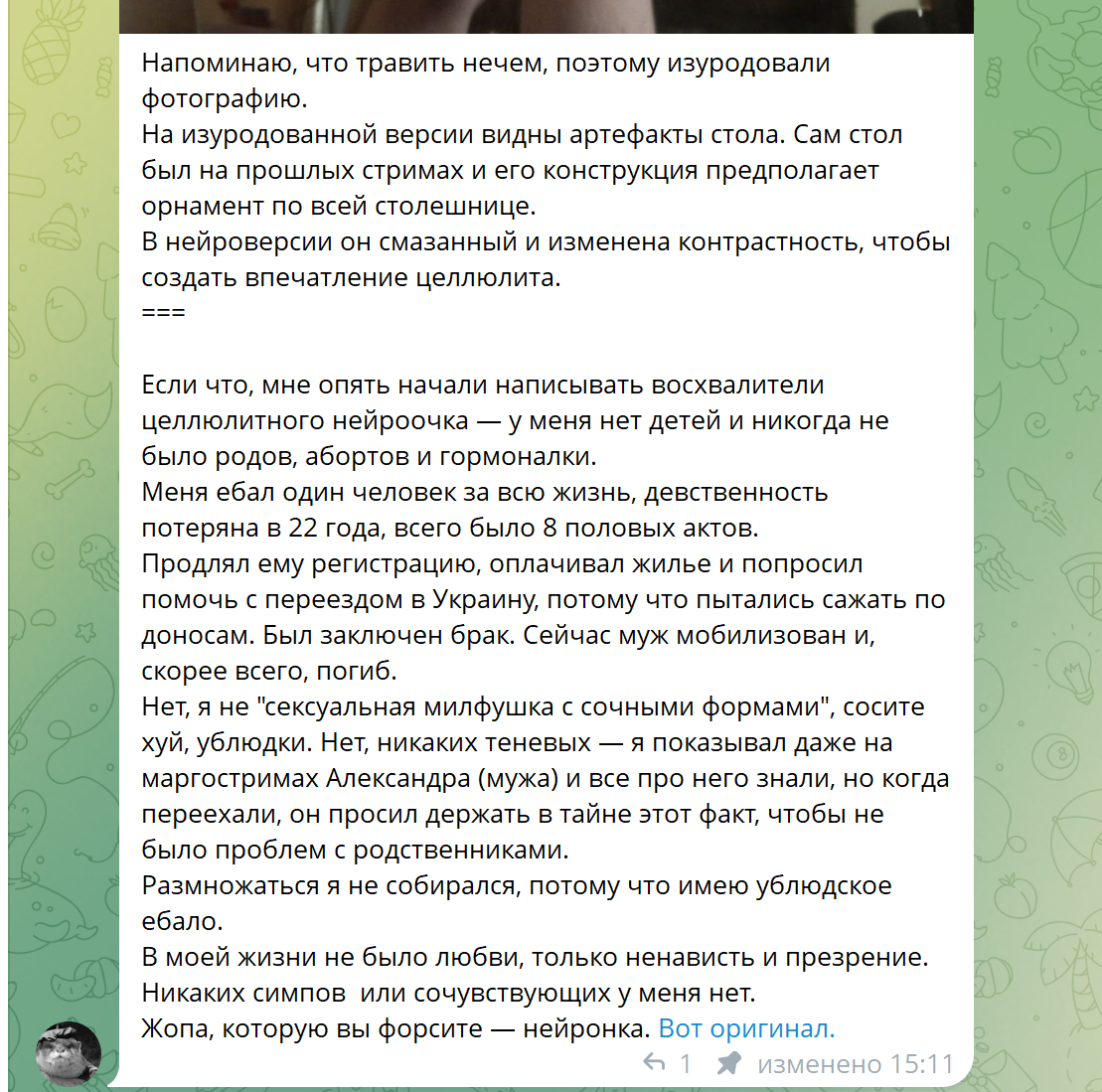 Напоминаю, что травить нечем, поэтому изуродовали фотографию. На изуродованной версии видны артефакты стола. Сам стол был на прошлых стримах и его конструкция предполагает орнамент по всей столешнице. В нейроверсии он смазанный и изменена контрастность, чтобы создать впечатление целлюлита.