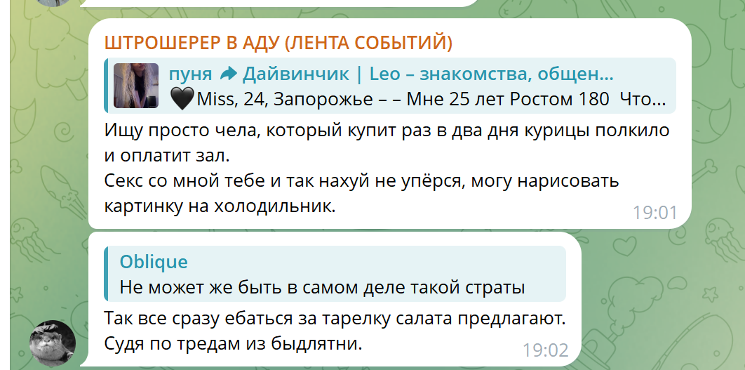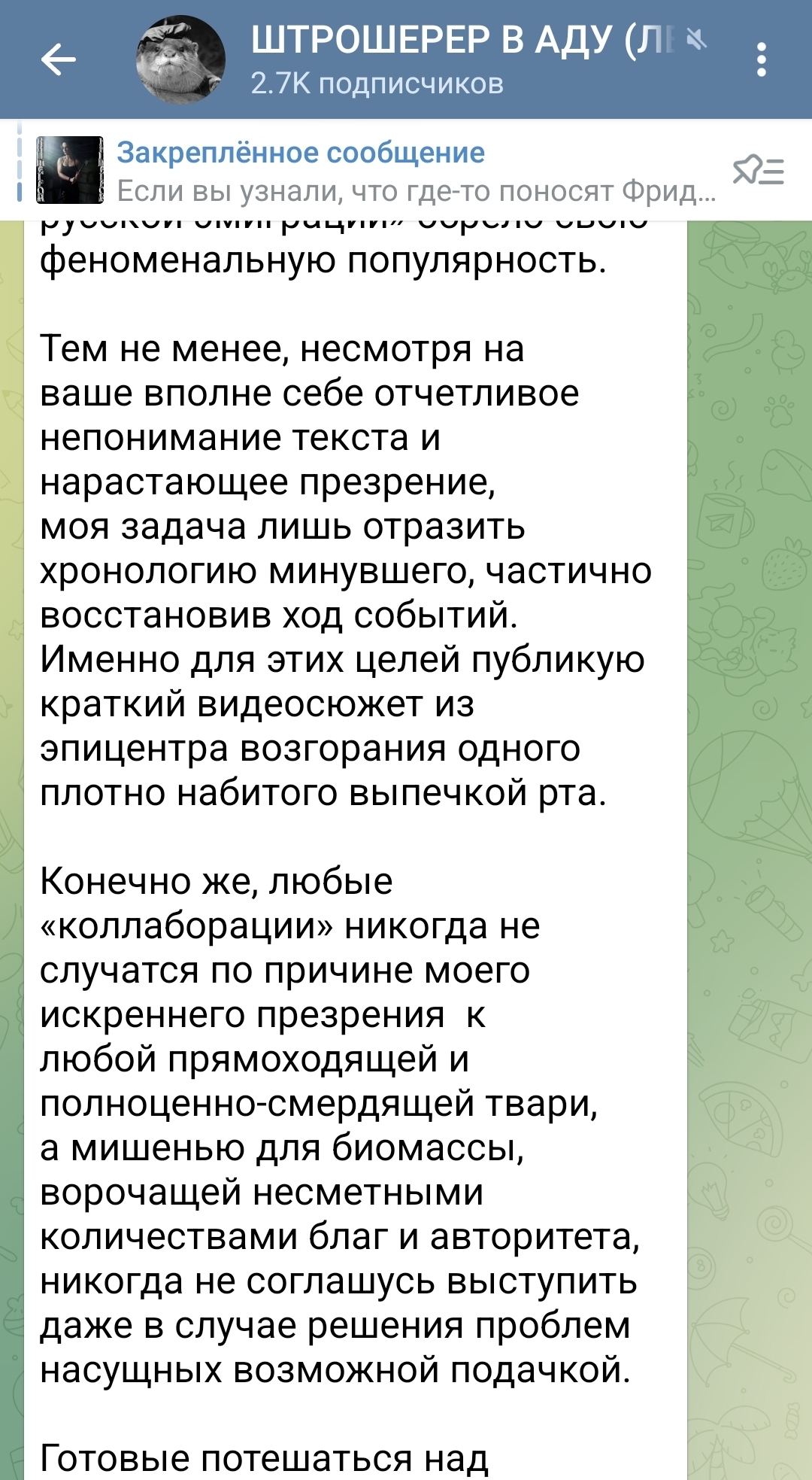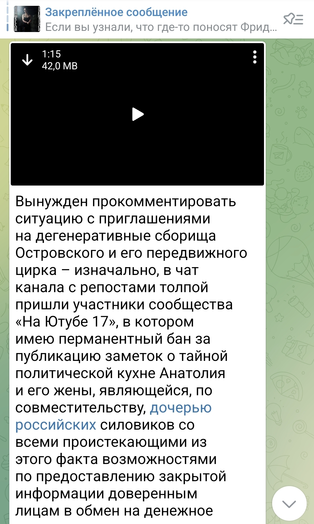 Вынужден прокомментировать ситуацию с приглашениями на дегенеративные сборища Островского и его передвижного цирка – изначально, в чат канала с репостами толпой пришли участники сообщества «На Ютубе 17», в котором имею перманентный бан за публикацию заметок о тайной политической кухне Анатолия и его жены, являющейся, по совместительству, дочерью российских силовиков со всеми проистекающими из этого факта возможностями по предоставлению закрытой информации доверенным лицам в обмен на денежное вознаграждение.