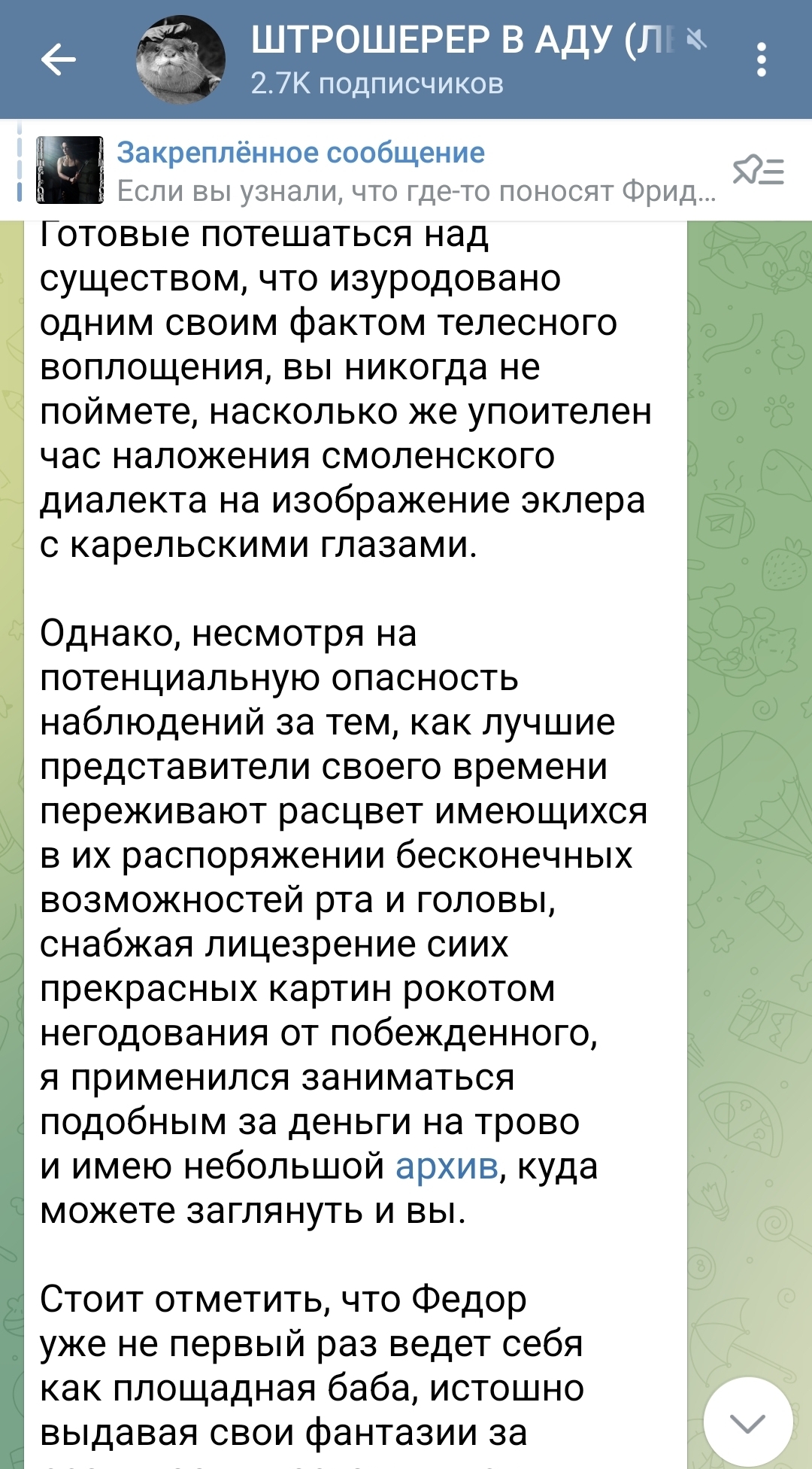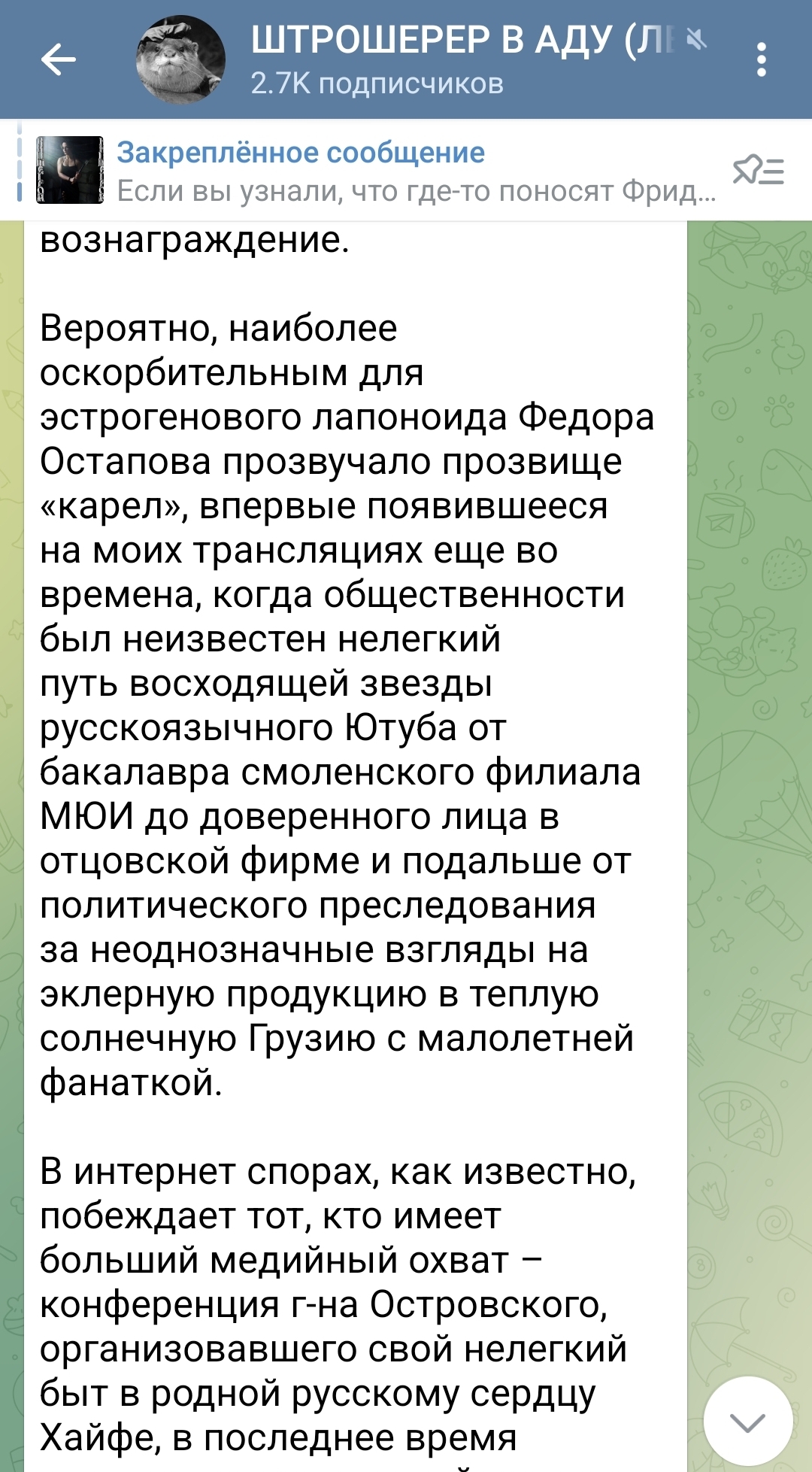 Вероятно, наиболее оскорбительным для эстрогенового лапоноида Федора Остапова прозвучало прозвище «карел», впервые появившееся на моих трансляциях еще во времена, когда общественности был неизвестен нелегкий путь восходящей звезды русскоязычного Ютуба от бакалавра смоленского филиала МЮИ до доверенного лица в отцовской фирме и подальше от политического преследования за неоднозначные взгляды на эклерную продукцию в теплую солнечную Грузию с малолетней фанаткой.
