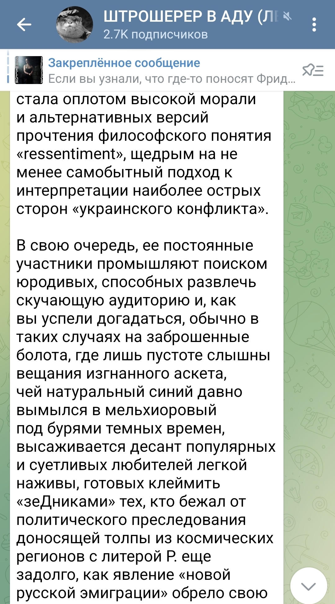 В свою очередь, ее постоянные участники промышляют поиском юродивых, способных развлечь скучающую аудиторию и, как вы успели догадаться, обычно в таких случаях на заброшенные болота, где лишь пустоте слышны вещания изгнанного аскета, чей натуральный синий давно вымылся в мельхиоровый под бурями темных времен, высаживается десант популярных и суетливых любителей легкой наживы, готовых клеймить «зеДниками» тех, кто бежал от политического преследования доносящей толпы из космических регионов с литерой Р. еще задолго, как явление «новой русской эмиграции» обрело свою феноменальную популярность.