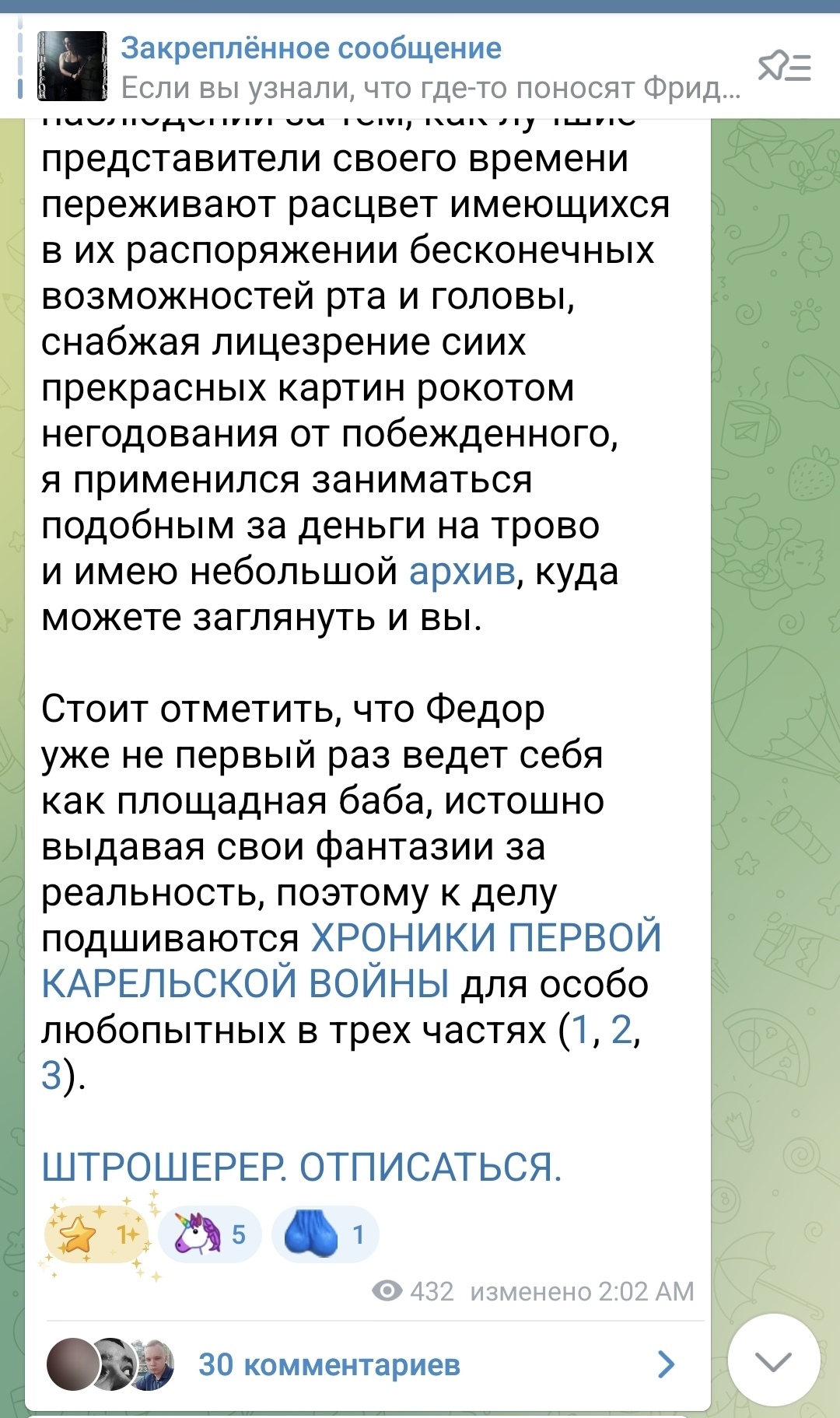 Стоит отметить, что Федор уже не первый раз ведет себя как площадная баба, истошно выдавая свои фантазии за реальность, поэтому к делу подшиваются ХРОНИКИ ПЕРВОЙ КАРЕЛЬСКОЙ ВОЙНЫ для особо любопытных в трех частях (1, 2, 3).