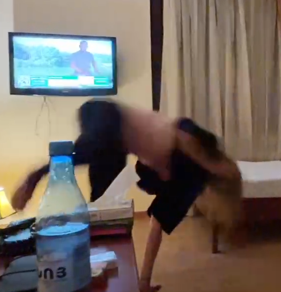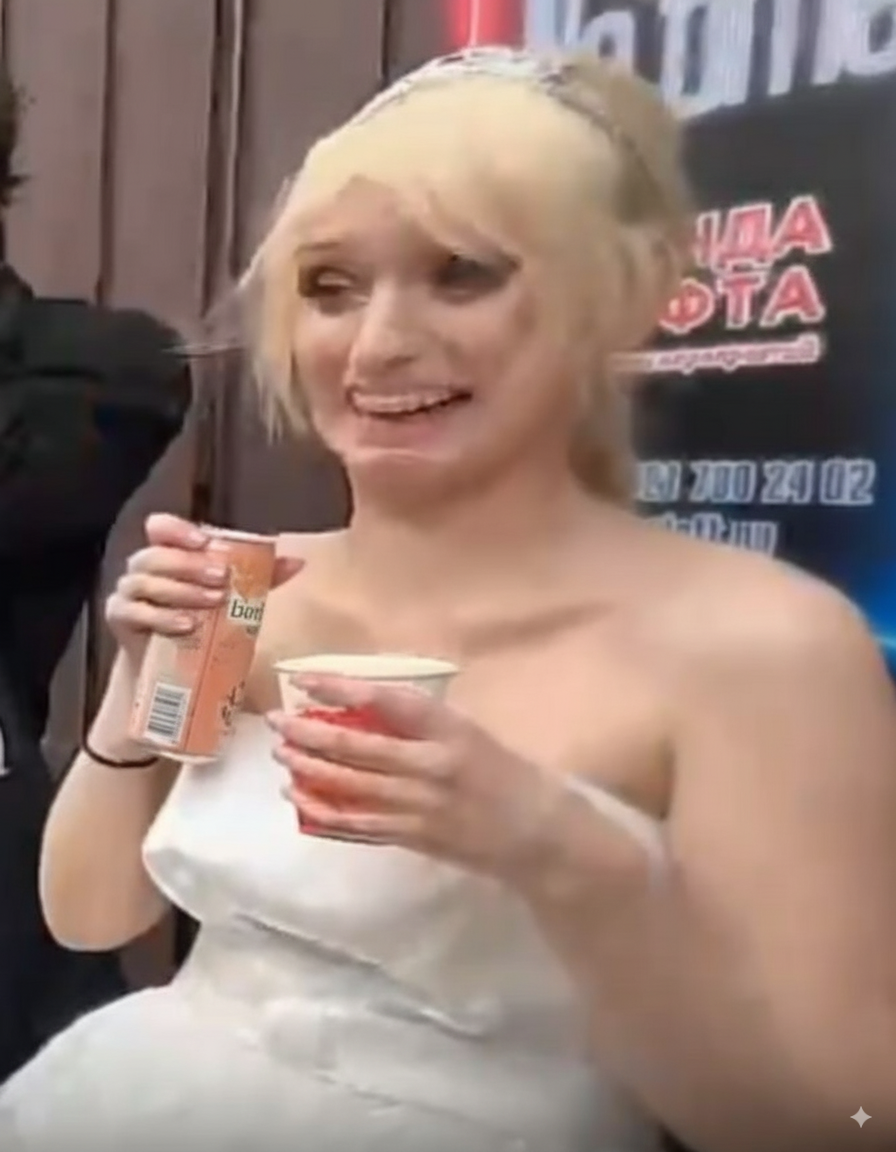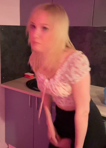 Толстая полторашка с лишним весом, пушапом и немытыми волосами, в каком-то дешевом костюме с алика пытается изобразить что-то вроде танца, нелепо дёргаясь.