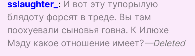 >>25508224 >А Ненорме провел Мэдиссон и что стояла пару недель на заставке у жопича Дебил, ты хуйню несешь. Ненормова стримила много лет до жопича и всегда была в разы популярней Калюхи. У жопича её зафорсили относительно недавно и в основном это делал шизоид колясочник артуррнг, который доёбывал жопича и его подсосов, делал мемалерты, кидал её клипы в телегу подсосов, но так и не добился того что она у него изначально просила, на мафию её не приняли. А заставка на фоне хуйня, потому что жопич не говорил кто это и там была просто анимешка, а не фото Ненормовой, так что пиар нулевой. Свет в будку жопич ей не проводил, она никогда не была его подсосом официально, и не была на его стримах. >И это и есть то самое пресловутое "развитие" к которому надо стремиться? Даже без всяких жопичей Ненормова в разы популярней на твиче и в стримерской среде, чем калюха, которая просто малоизвестная дностримерша с полудохлыми соцсетями. И смотрят её только пара сандалек и еще пара человек, которые пришли от Ненормовой.