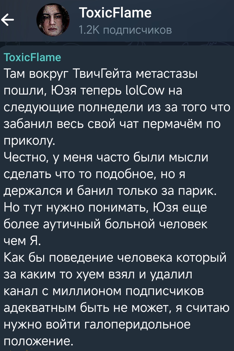 Мой любимый момент это когда он на эмоциях побанил челов. А когда спросили за что так без предупреждения, вместо того чтобы просто признать что сгорел, начал выдумывать задним числом какую-то историю охуительную про то что он пять лет терпел. Это такая частая хуйня в спорах каких-то эмоциональных. Когда человек не хочет признавать в себе косяк и начинает придумывать лор который его оправдает. Я это видел десятки раз по жизни, а тут это так красиво показано, синема.