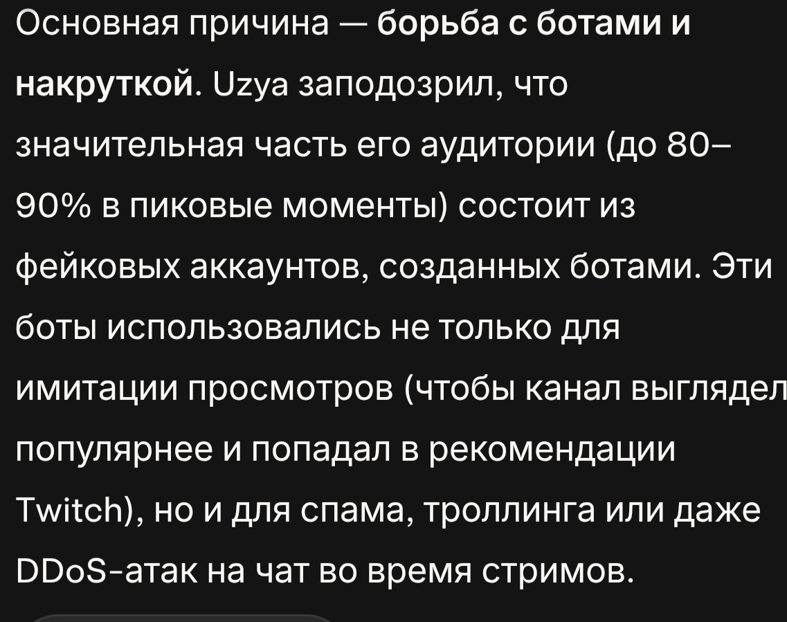 Вы не понимаете как крутят ботов. Боты крутятся от числа живых зрилов. То есть например на 1 живого зрила накручивают 10 ботов и тд, коэффициент может быть разным. Поэтому у стримера с 2 живыми зрилами не может быть 3к онлайна с ботами, все будут видеть мертвый чат Так вот у юзи было настолько мало живых зрилов что агентство попросту не смогло накрутить ему ботов до 1к онлайна