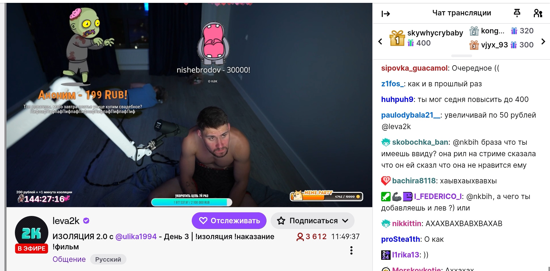 >>25481758 Шейхи кидали десятки тысяч рублей за то чтоб стример яйцо об голову разбил, и всё это на 100 - 200 онлайна, а тут 8к и каких только шизов среди них нет. Блеву смотрят лудики и казиношники, периодически донатят в крипте или просто мажорики залетают. В прошлую изоляцию дотер Ростик по 20к кидал, в эту тоже стримеры время от время залетают, донаты могут быть вполне реальными