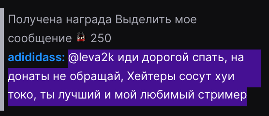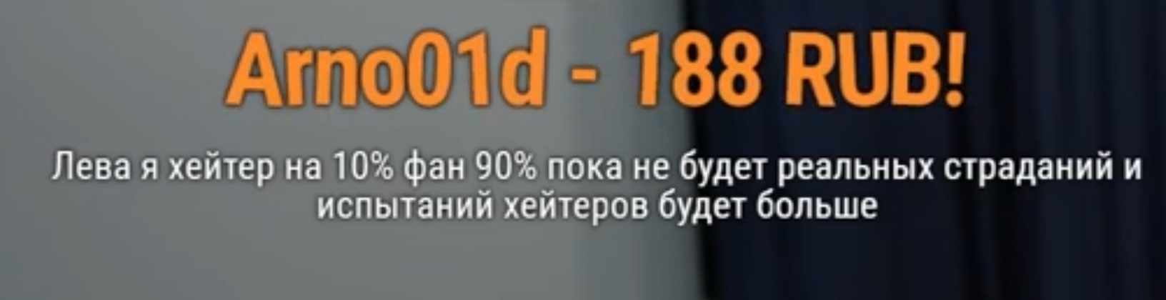 Вот тут некоторые пишут за самодонаты у недоактера, бойз или еще кто их кидает - неважно. Для меня самый прозрачный пример того, что это хуйло их активно юзает - это его первый трип по странам, когда он то ли, в Аргентину, то ли в Корею аук проводил, взял в руки телефон, и тут хуяк, прилетает ебанутая котлета, там сразу чат взвыл мол "САМОДОНАТ!! А НЕ АХУЕЛ ЛИ ТЫ", он чуть почитал, покривлялся, неуклюже улыбнулся и говорит "Да всее щас уберу, щас уберу" и реально нахуй убрал) Я это на всю жизнь запомнил и теперь, видя подобную хуйню, что ему, якобы, по ляму в день пиздячат, ни в чем даже не сомневаюсь