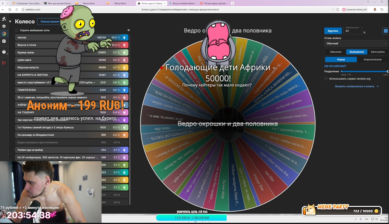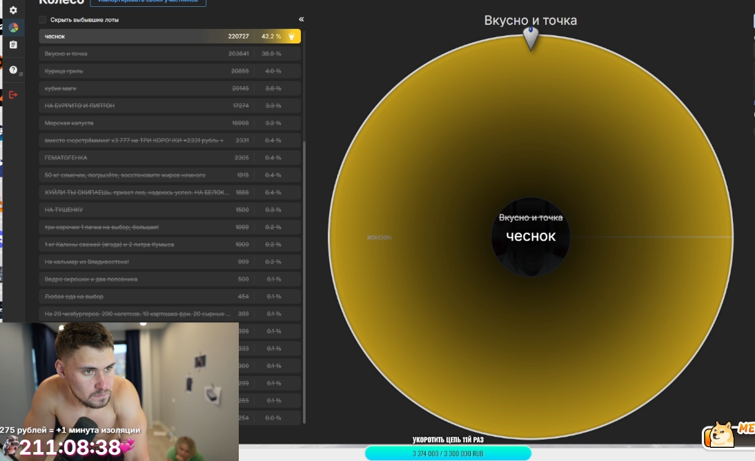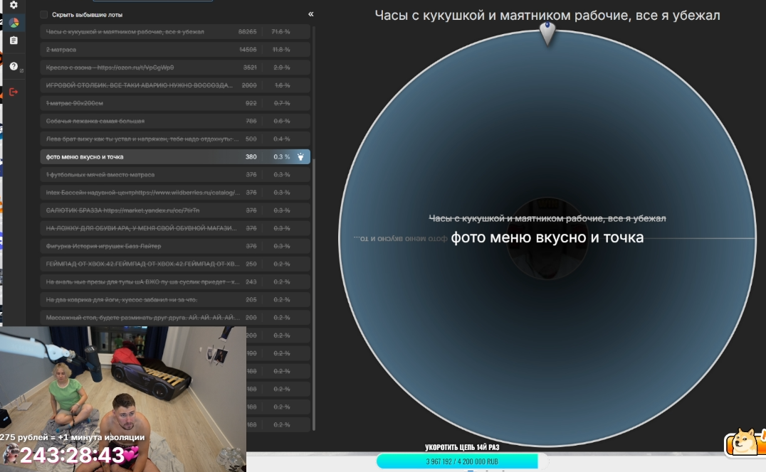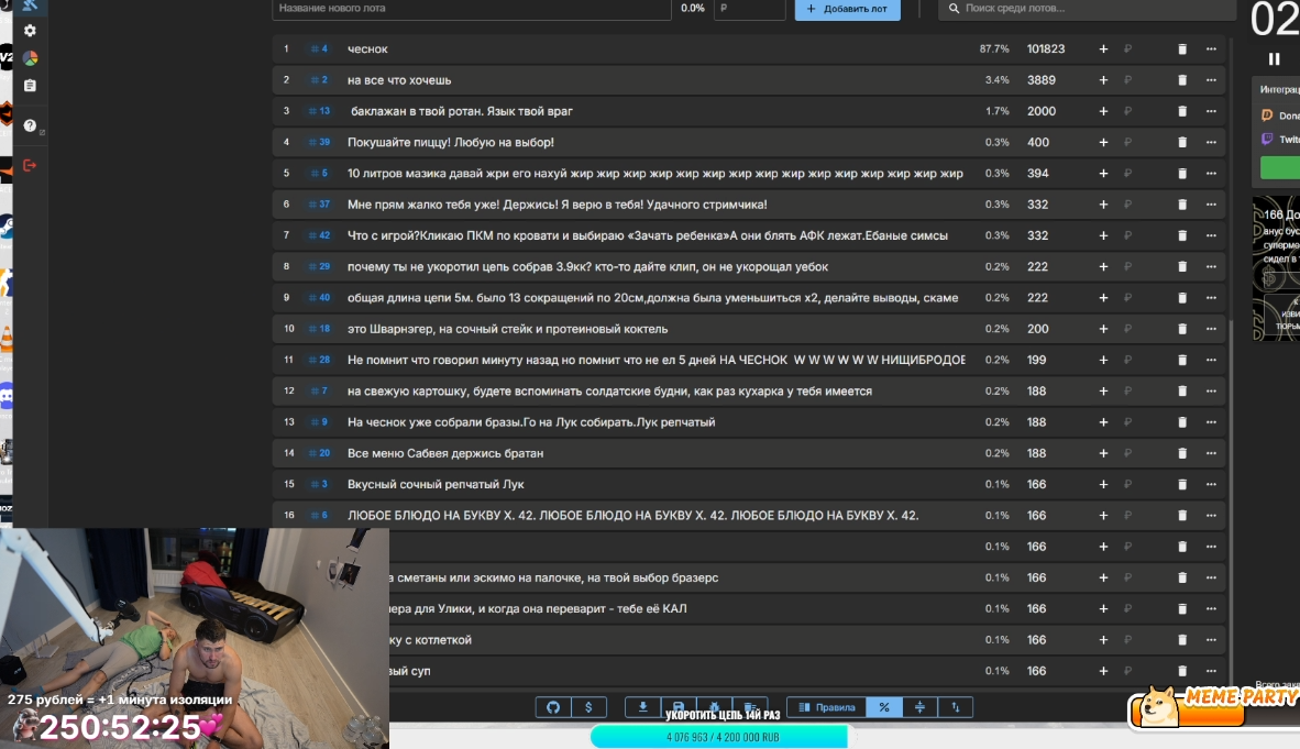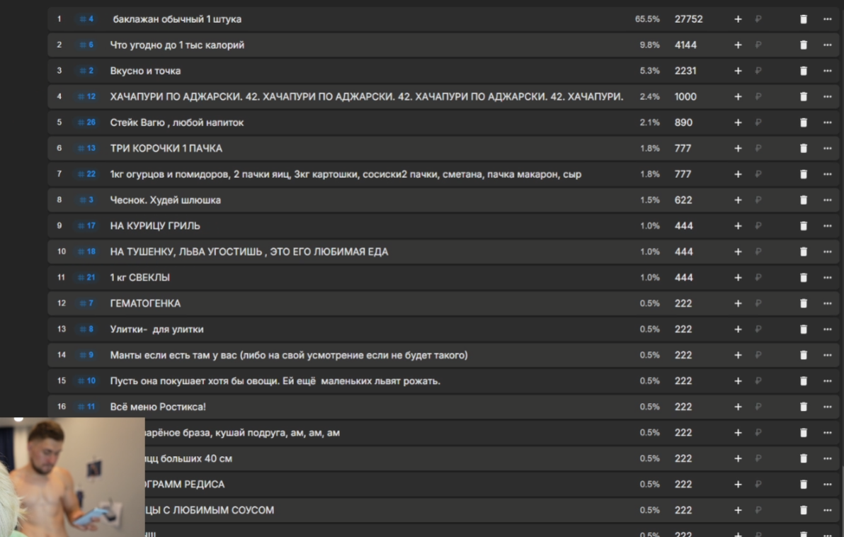 я так и не понял нахуя дауны донатят на нормальные лоты с едой. в смысл? у зрилов задача наоборот должна быть заставить его сдаться, а как он сможет сдаться, если каждый день ему кидать мак и пиццу? таким образом он не 80 часов просидит, а 200 или даже 300
