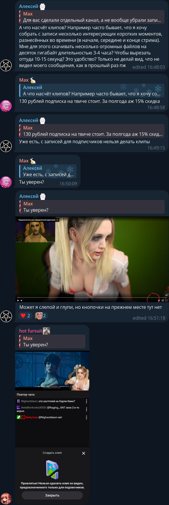 Вы если клипы не пишите, то хоть тайминги примерные к описанию добавляйте когда что-то интересное или противоречивое происходит. А то клипающие не всегда стримы смотрят
