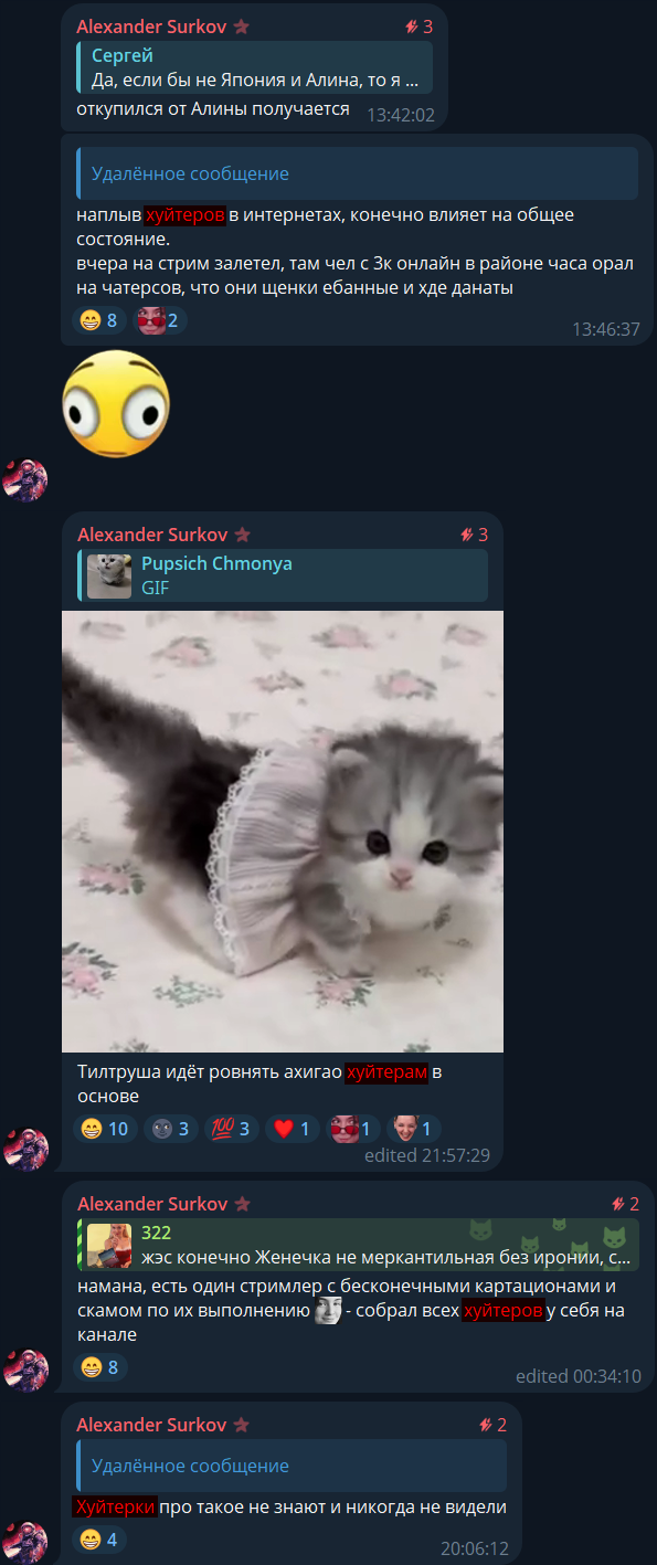 "Хуйтерки" в приватке писало всего 3 человека: лакрецкай, ценитель и гол. Лусецкай вряд ли будет что-то перекрывать сейчас на дваче и у него всего два таких сообщения, а вот у двух других ебанатиков их гораздо больше.