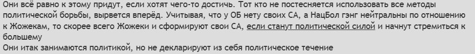 >У них не настолько мало мозгов, чтобы залетать в паблики разных лагерей и говорить о том, что они вдруг должны уничтожить друг-друга Они всё равно к этому придут, если хотят чего-то достичь. Тот кто не постесняется использовать все методы политической борьбы, вырвется вперёд. Учитывая, что у ОБ нету своих СА, а НацБол гэнг нейтральны по отношению к Жожекам, то скорее всего Жожеки и сформируют свои СА, если станут политической силой и начнут стремиться к большему Они итак занимаются политикой, но не декларируют из себя политическое течение
