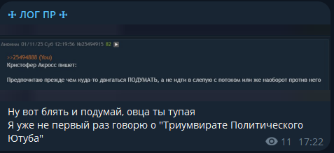>Я буду удовлетворён, если разрушу Триумвират Политического Ютуба Невозможно уничтожить то, что является неверным лишь в твоей голове, ибб большинство разъебёт тебя намного раньше