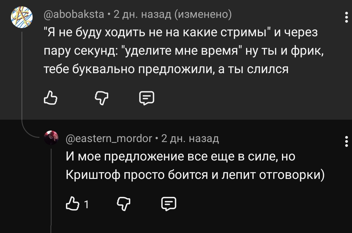 Не было прям такой горизонтальной связи. Просто он пригрозил мне, а я на рефлексах нахуй послал В принципе это было давно и я давно забил хуй, можно даже с ним постримить, если он хочет
