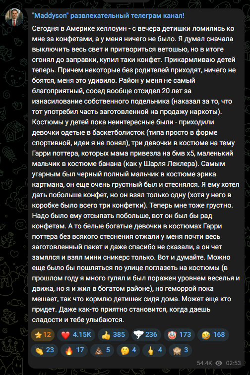 Самым угарным был черный полный мальчик в костюме эрика картмана, он еще очень грустный был и стеснялся. Я ему хотел дать побольше конфет, но он взял только одну (хотя у него в коробке было всего три конфетки). Теперь мне тоже грустно. Надо было ему отсыпать побольше, вот он был бы рад конфетам. А то белые богатые девочки в костюмах Гарри поттера без всякого стеснения