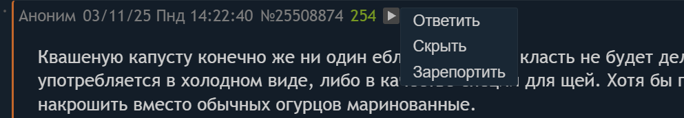 >>25508732 > квашеной капустой он же кислая. квашеную капусту православно употреблять в холодном виде, предварительно заправив подсолнечным маслом и репчатым луком по вкусу. никакой термической обработки