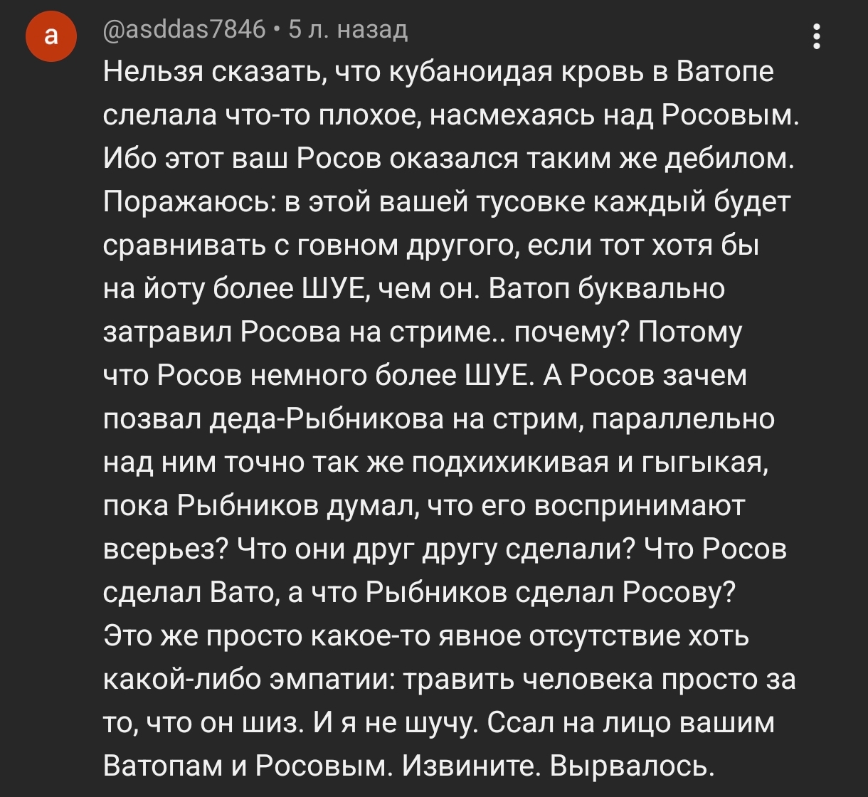 Дебил блядь. Новый день, новый кринж >Росов не входит в этот клуб Еще бы. А он собирался? С ранних дней ебало воротил, типа «я не такой, как эти», «мне противно от ваших сравнений».