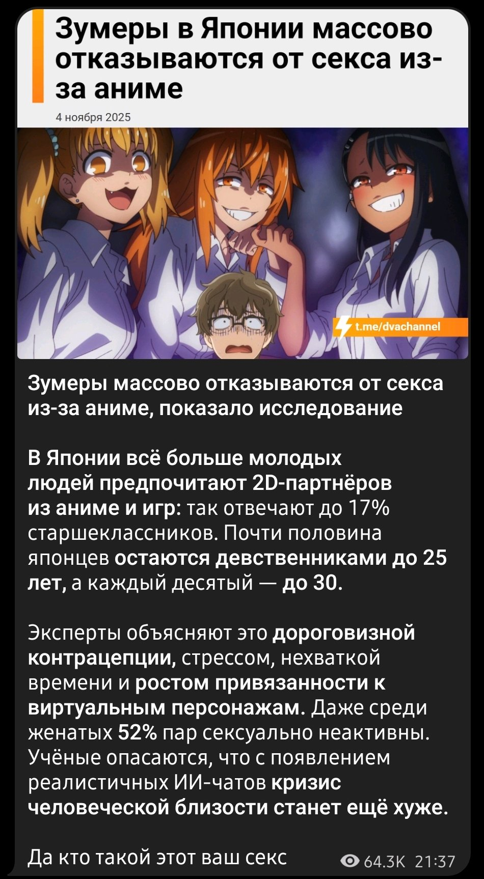>Японцы остаются девственниками до 25 лет из-за аниме и компьютерных игр. >В стране рекордно низкая рождаемость и натуральный анти-секс бум: около 50% людей остаются девственниками до 25 лет, а около 10% не имели сексуального опыта к 30 годам.