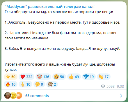 В последнем посту Илюхи я бы баб на первое место поставил. Они реально наносят вред твоей психики. Наркота и алкашка это скорее следствие уже поебанной психики.