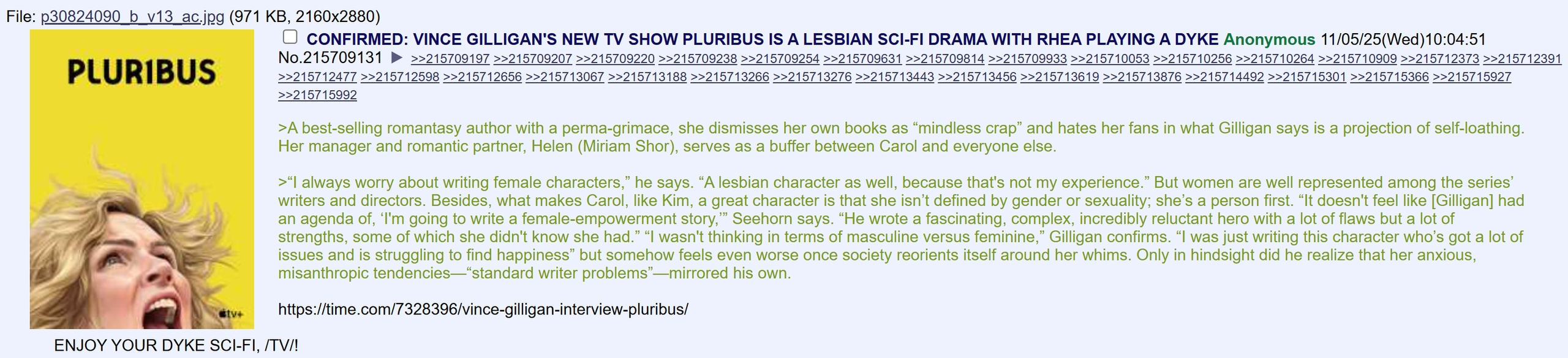 «Боже мой, это невероятно. Просто невероятно. Затягивает с первых сцен. Винс — настоящий гений! Пока ещё слишком рано об этом говорить, но… может быть, это новая интерпретация „Вторжения похитителей тел“? Оригинал 1955 года стал метаотражениями страхов эпохи Холодной войны — страха перед вторжением и тоталитаризмом. Может ли Pluribus быть сатирой на современную Америку — на социальные сети и разногласия? С нетерпением жду продолжения», — написал геймдизайнер.