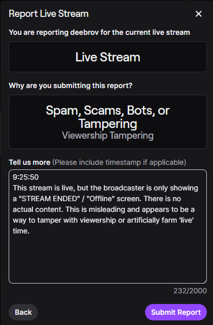 >>25545492 9:25:50 This stream is live, but the broadcaster is only showing a "STREAM ENDED" / "Offline" screen. There is no actual content. This is misleading and appears to be a way to tamper with viewership or artificially farm 'live' time.