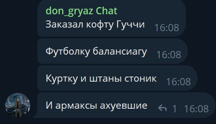 Сегодня Грязь выпил чуток и начал рассказывать как он любого разъебёт, быковал на охранников предлагал выскочить 1 на 1. И тут подходит чёткий мага отводит его в сторону, и настойчиво просит сбавить тон и свалить, ну Селюк начал истерично извиняться, говорить брат брат извини, и спешно свалил в заварку чтобы и там терпеть около входа, в итоге от хейта в чате оффнул с позором. Такие дела, это тебе не алкашей и нариков в нижнем бить, сыкло.