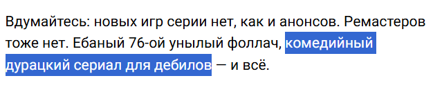Вдумайтесь: новых игр серии нет, как и анонсов. Ремастеров тоже нет. Ебаный 76-ой унылый фоллач, комедийный дурацкий сериал для дебилов — и всё.