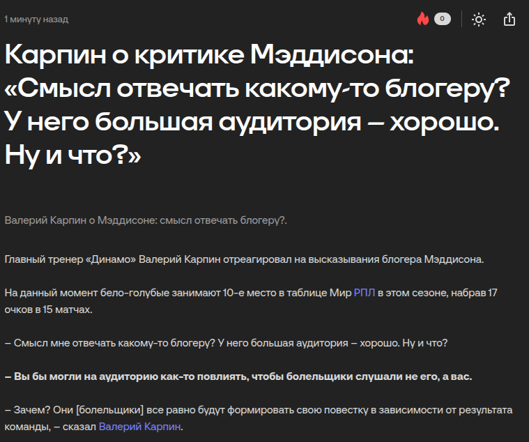 Если в «Динамо» реально хотят назначить Черчесова (это вообще пидец, тотальный физрук, ещё и на всю башку пиданутый, просто уе*ан невероятных, галактических масштабов), то я полностью за Карпина! Мне нравится и Осипенко, и футбол, который Карпин ставит, и превращение в «Ростов», и хамство в адрес клуба на прессухах. Остросюжетная борьба за выживание – просто отлично, интересно смотреть. Валерий Георгиевич, я с вами! Вам надо дать поработать — стример Илья Мэддисон