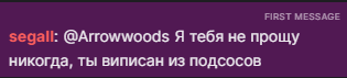 Короче как я и говорил один алкоскот без чувства границ, другой аутист который эти границы не может отстоять и выставить. Оба виноваты, но сама ситуация вообще уровня двух пиздюков лет 15ти. И уж явно ситуация не на то чтобы банить ару в ивентах, это не делает сосане плюсов.
