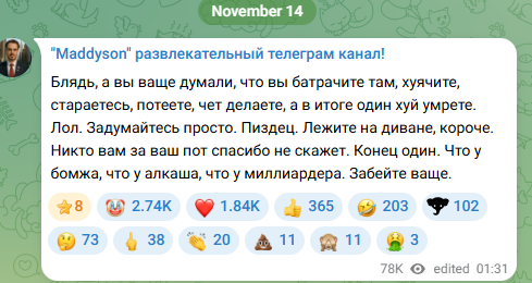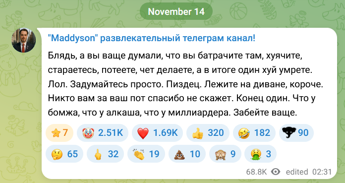 Блядь, а вы ваще думали, что вы батрачите там, хуячите, стараетесь, потеете, чет делаете, а в итоге один хуй умрете. Лол. Задумайтесь просто. Пиздец. Лежите на диване, короче. Никто вам за ваш пот спасибо не скажет. Конец один. Что у бомжа, что у алкаша, что у миллиардера. Забейте ваще.