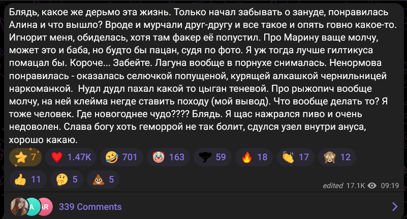 люди просто не понимают что за пределами интернета - илюша не такой крутой как на экране монитора. и все эти истории "пошёл к шлюхе" шиты белыми нитками. поверю что он легко мог кому-то из ТУСОВКИ присунуть типа Вастиковой, а в рандомную шлюху не верю. они неуверенных в себе додиков вычисляют за 3 секунды за счёт большого жизненного опыта. к тому же если был публичной персоной к тому моменту.