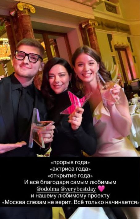 Так. Друзья. Спешу поделиться с вами радостной новостью. Я лауреат премии журнала Кинорепортёр в номинации «Прорыв года». Очень приятно,честно сказать. За этот год было много важных работ. «Лермонтов» Бакура Бакурадзе, «Дети перемен» Серёжи Тарамаева и Любови Львовой, «Фишер 2» Саши Цоя и конечно же «Москва слезам не верит: Все только начинается.» Оли Долмотовской и Жоры Крыжовникова. Без последней картины ,думаю,моей победы бы не было. Поэтому Оля и Андрей,я вас обожаю и от всего сердца благодарю. Так же благодарю Марию Лемешеву и всю редакцию журнала Кинорепортер за высокую оценку моего труда. Благодарю своих родителей. Своего агента. Всех близких людей,которые рядом. А награду я посвящаю Савве Максимову. Все мое -его. Спасибо всем большое еще раз!