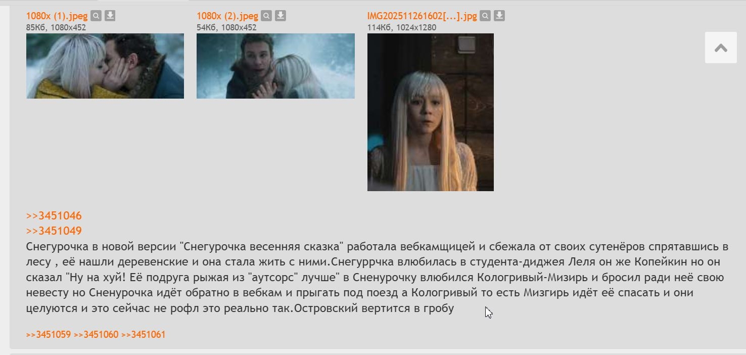 >>25649779 Казалось бы всем хватило ебнутой Алисы в стране чудес но нет,для полноты картины нужна ещё Снегурочка что работает вебкамщицей и прыгает под поезд.