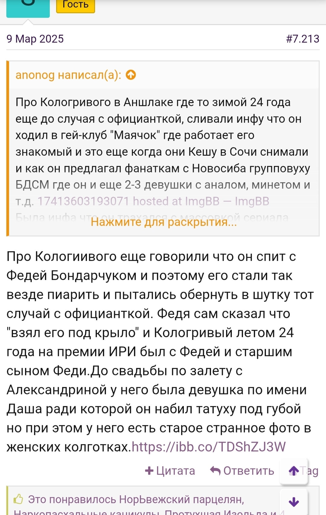 >>25863648 Реально тут пасутся?Я просто отчётливо помню что обсуждали узбечку и кто-то предположил что Санька Каловая залетала от Кала чтобы тот её не бросил потому что свадьба была уже с пузом а тут внезапно Гандон Асс несёт тоже самое и про то что Кал там якобы с Федей ебется тоже тут было сначало.